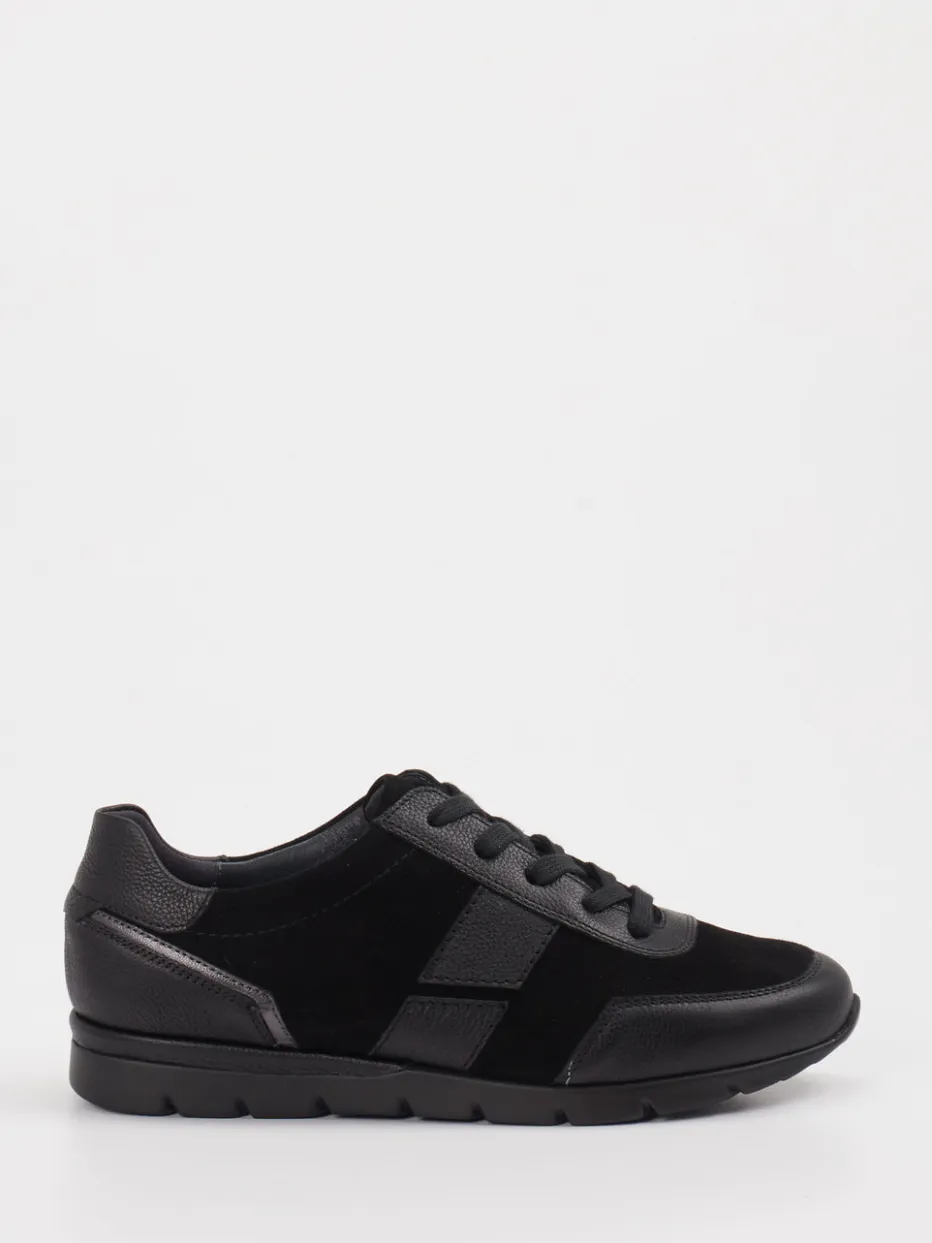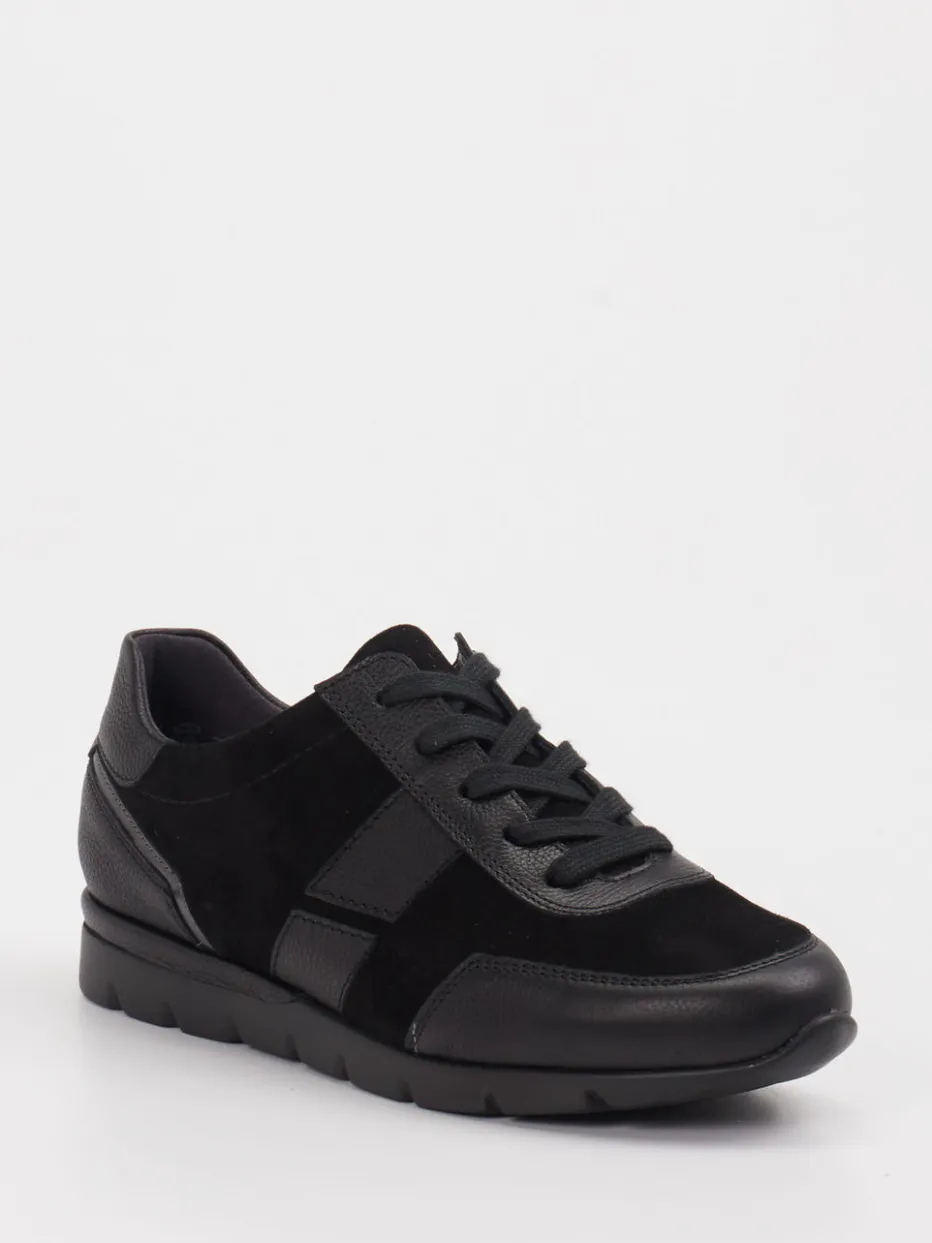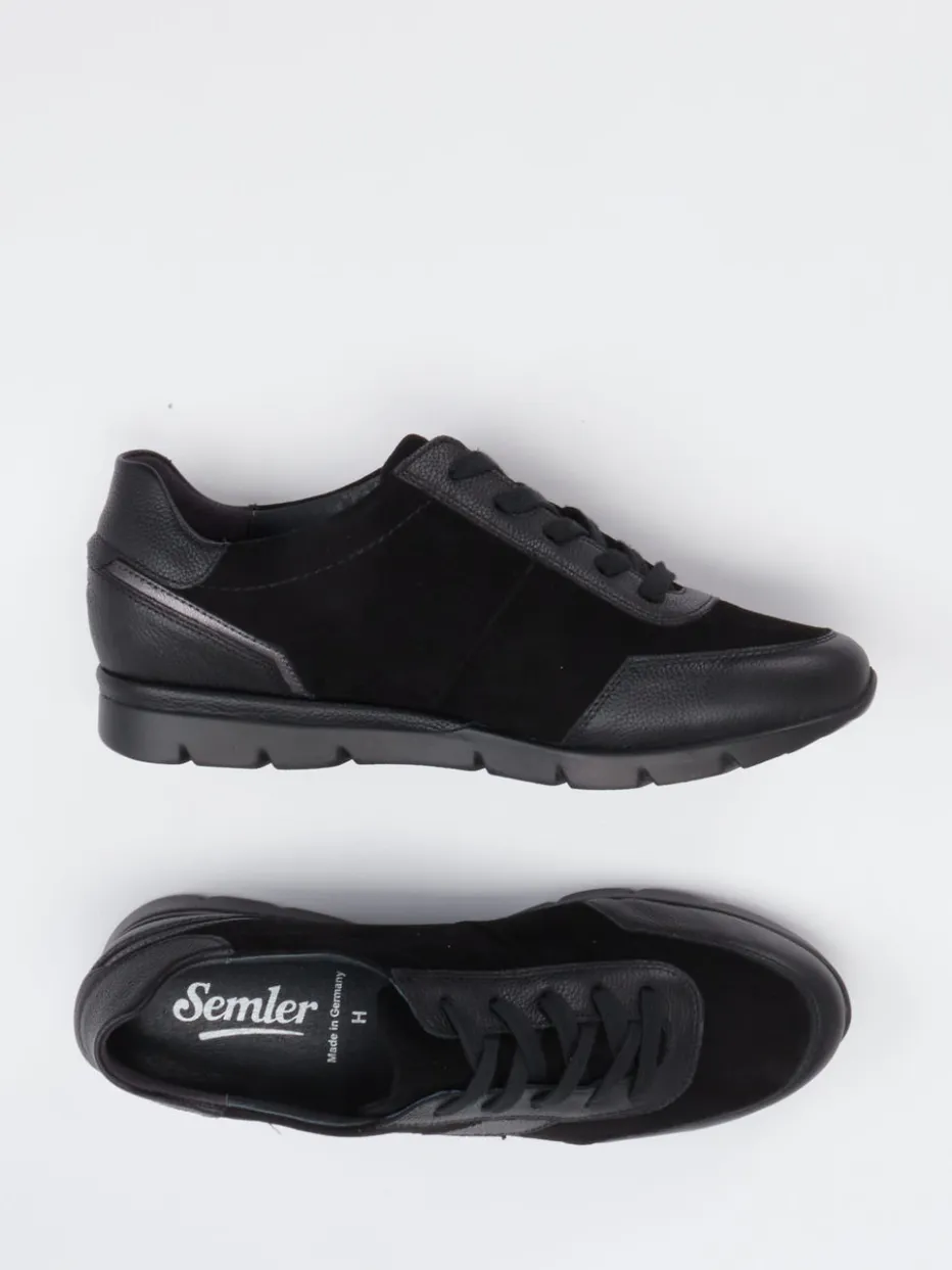 Schwarz trifft auf Strukturtiefe. Der Damen-Sneaker von Semler überzeugt als stilbewusster Begleiter für Alltag und Freizeit. In monochromem Schwarz zeigt sich dieser Komfortsneaker mit einem hochwertigen Mix aus glattem und samtigem Leder, was für interessante Materialkontraste sorgt. Die klassische, flache Form, eine profilierte PU-Laufsohle und der gepolsterte Schaftrand unterstreichen den funktionalen Komfortanspruch. Dank Schnürung sichert der Schuh optimalen Halt, das Textil-Leder-Futter rundet das Tragegefühl ab. Die Ton-in-Ton-Optik und die ruhige Linienführung betonen den „Quiet Luxury“-Trend – ideal für minimalistische Looks. Mit herausnehmbarer Innensohle bietet er zusätzlichen Komfort im Stil von Semler.