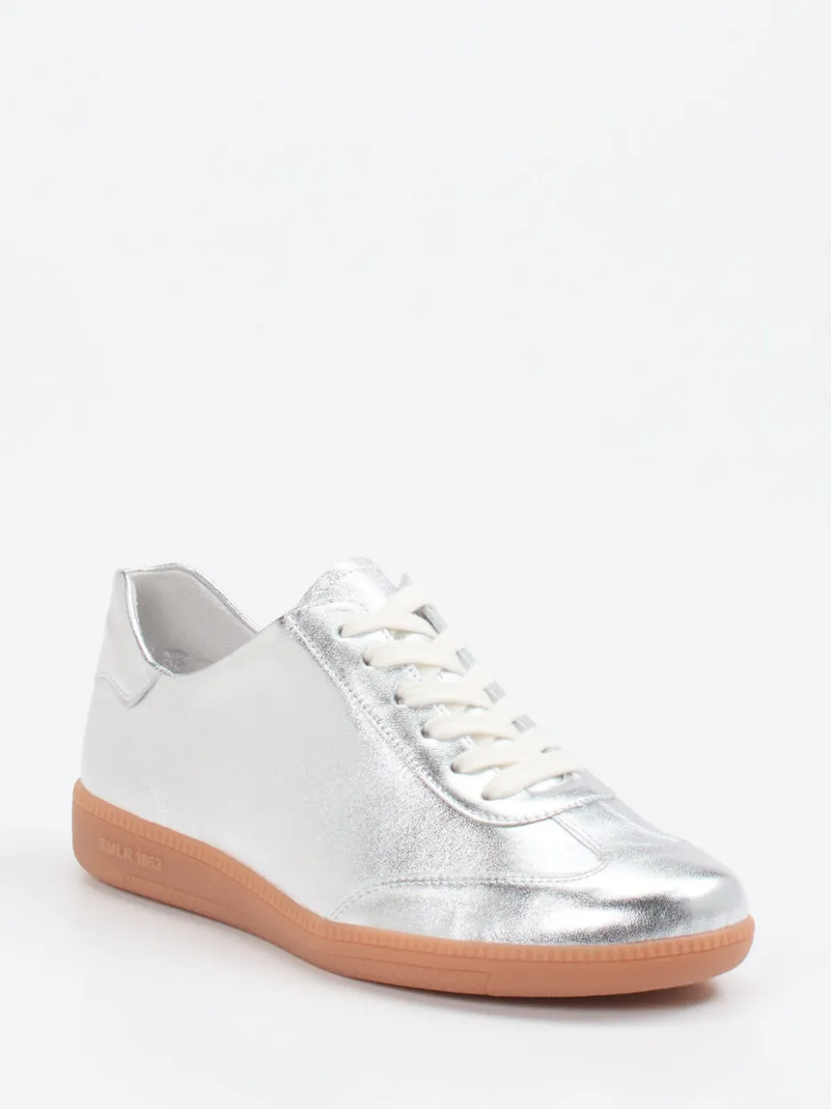 Ob zum Stadtbummel oder zum Ausgehen: Das butterweiche Metallicleder in glänzendem Silber unterstreicht den modischen Anspruch dieses Sneakers. Die klassische, flache Silhouette wird durch cremeweiße Schnürsenkel und eine kontrastierende, rutschfeste Gummisohle mit Logo geprägt. Innen sorgt ein weiches Leder-/Textilfutter für Komfort, während das gepolsterte Wechselfußbett ideal für Einlagen geeignet ist. Inspiriert von Streetwear und Minimalismus, passt das Modell perfekt zu oversized Denim oder Metallic-Accessoires.