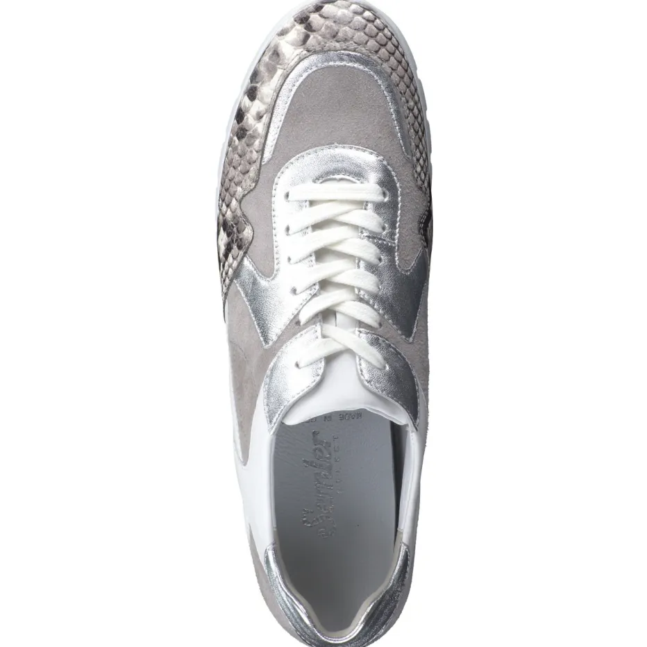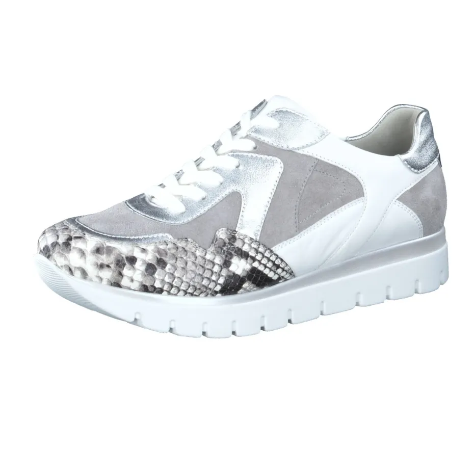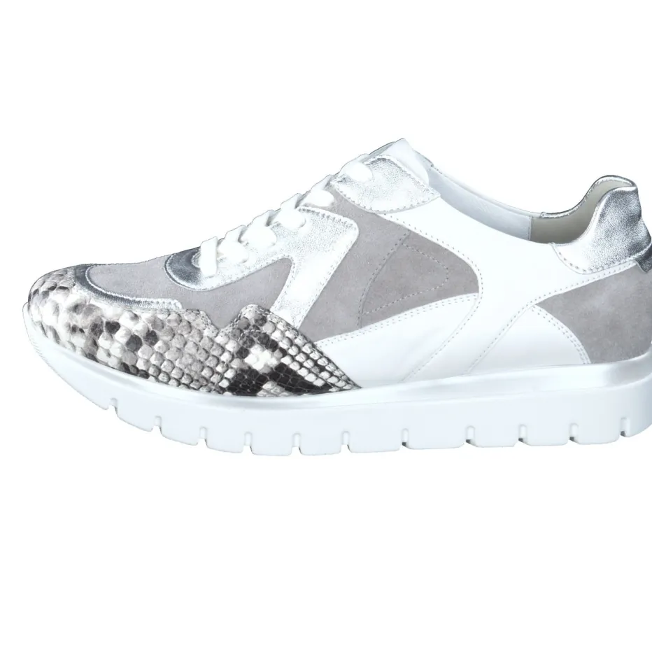 Sportlicher Schick mit modernem Akzent.Der Sneaker von Semler vereint Komfort und Designkompetenz mit femininer Note. Ideal für entspannte Stadttage oder stylische Alltagsmomente bietet dieses Modell einen modernen Materialmix aus hellgrauem Veloursleder, glattem Leder und effektvoll eingesetzten Metallic-Partien in Silber. Die strukturierte Schlangenprägung sorgt für einen auffälligen Look mit modischem Anspruch. Mit ergonomisch gepolsterter PU-Sohle, Wechselbett und Weite H wird ganztägiger Komfort gewährleistet. Inspiriert von Streetwear-Elementen ist die klassisch-sportive Form perfekt kombinierbar mit hellen Jeans und silberner Crossbody-Bag. Ein modischer Schnürschuh mit sichtbarem Wohlfühlversprechen made by Semler.