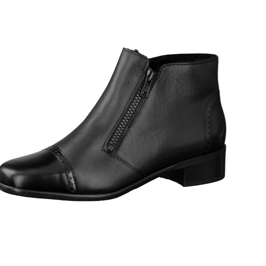Eleganz trifft Alltagstauglichkeit.Semler präsentiert eine Damen-Stiefelette aus hochwertigem Kalbleder, ideal für Büro und Freizeit. Ihr schwarzes, glänzendes Kalbleder zeigt handwerklich platzierte Broguing-Details an Ferse und Kappe. Die klassisch-knöchelhohe Silhouette auf leichter Gummisohle wird durch einen blockigen 3 cm Absatz ergänzt, der stabilen Tritt gewährt. Innen sorgt weiches Weblamm-Futter an kühleren Tagen für angenehme Wärme, während der seitliche Reißverschluss das Anziehen erleichtert. Das herausnehmbare Fußbett macht Platz für individuelle Einlagen. Die minimalistische Gestaltung erhält durch dezente Heritage-Elemente einen zeitlosen Look. Ein Modell voller Understatement mit Fokus auf Komfort und Stil – typisch Semler.