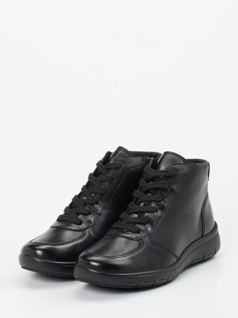 Minimalismus trifft Komfort.Semler präsentiert eine komfortbetonte Damen-Stiefelette für Alltag und Freizeit. Weiches schwarzes Kalbleder mit seidigem Glanz prägt das Design dieser knöchelhohen, sportlich-kompakten Schnürstiefelette. Eine Kombination aus Schnürung und innenliegendem Reißverschluss erleichtert das An- und Ausziehen. Das Innenfutter aus weichem Textil sowie das gepolsterte, austauschbare Fußbett sorgen für angenehmes Tragegefühl. Die profilierte PU-Luftpolstersohle mit integrierter Dämpfung unterstützt ein ermüdungsfreies Gehen – auch auf längeren Strecken. Dezente Ton-in-Ton-Nähte und das puristische Erscheinungsbild passen ideal zum Quiet-Utility-Look. Semler vereint orthopädischen Anspruch mit stilistischer Zurückhaltung und Qualität.