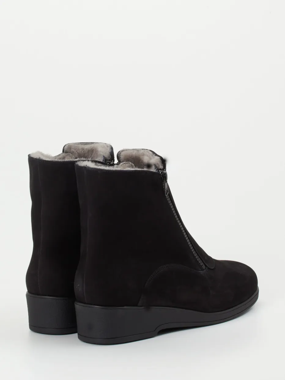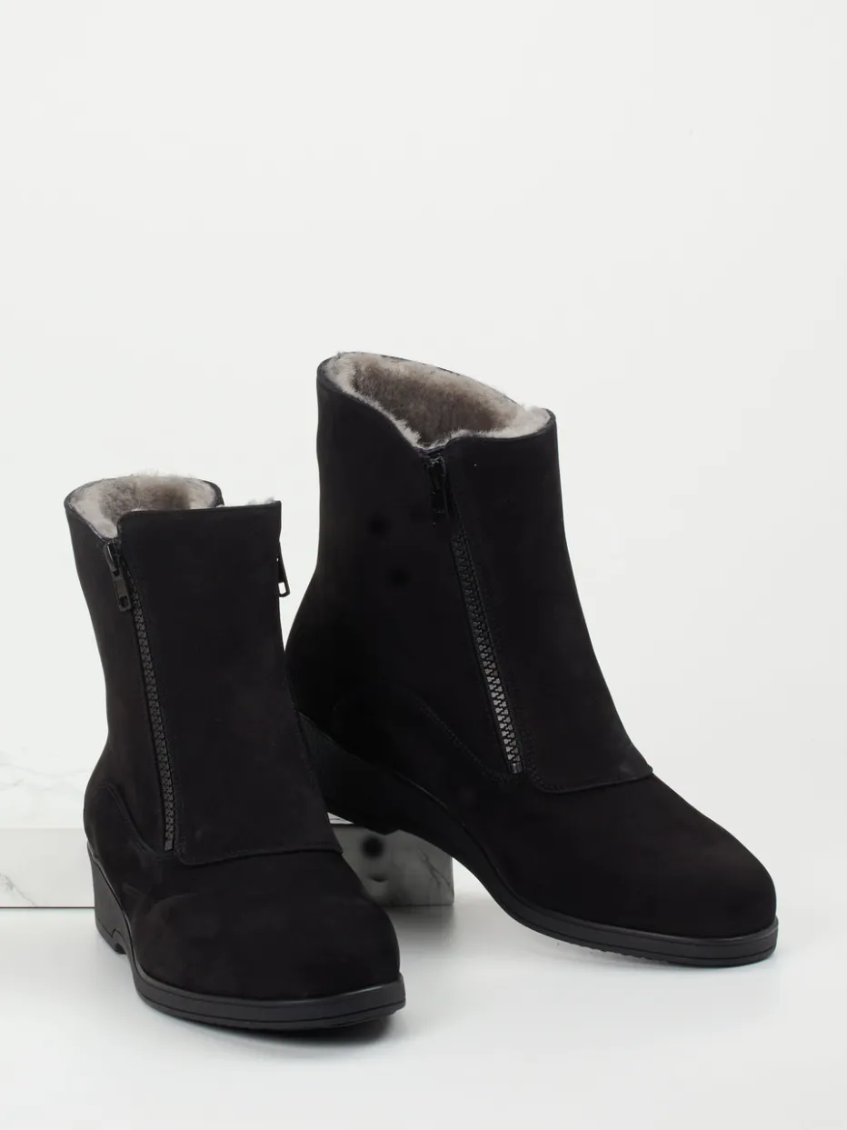 Wärmender Komfort für den Winter.Semler präsentiert eine Damen-Stiefelette für kalte Tage. Ob beim Winterspaziergang oder im Alltag – die schwarze Stiefelette aus samtig angeschliffenem Nubukleder bietet zuverlässige Wärme dank ihres natürlichen Lammfellfutters. Der knöchelhohe Schnitt mit beidseitigen Reißverschlüssen sorgt für hohen Komfort beim An- und Ausziehen. Die dezente Optik mit Ton-in-Ton-Nähten und matter Oberfläche passt zum minimalistischen Quiet-Luxury-Stil. Die rutschhemmende Gummisohle mit leichtem Keilabsatz vereint Stabilität mit dezentem Schick. Ideal zu Thermoleggings und Wollmantel. Semler steht für orthopädische Expertise mit modischer Finesse.
