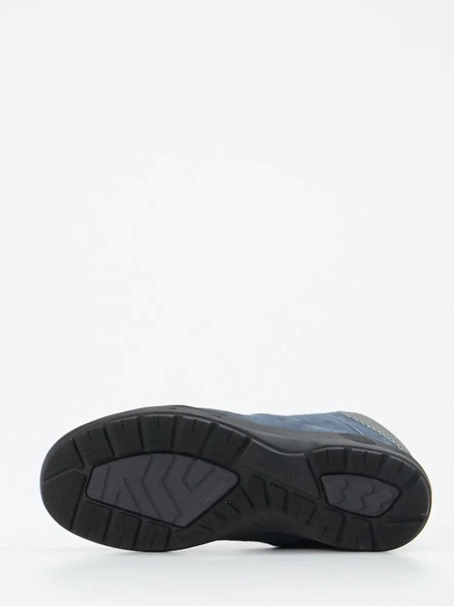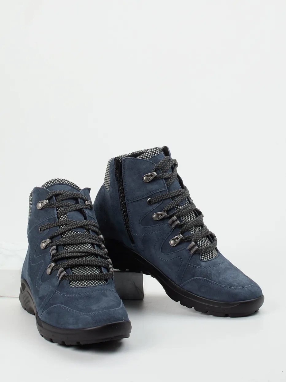 Modern gewandert. Sicher gestylt.Semler präsentiert eine knöchelhohe Damen-Stiefelette für urbanes Terrain und leichte Wanderwege. Das tiefblaue Veloursleder wirkt durch seinen matten Look besonders wertig und erhält durch gestrickte Mesh-Einsätze an Schaft und Zunge ein sportliches Finish. Die Metallösen-Schnürung im Bergsteigerstil sorgt für individuellen Halt, ein seitlicher Reißverschluss ergänzt den unkomplizierten Einstieg. Die profilierte PU-Sohle federt jeden Schritt ab und steht für angenehmen Laufkomfort, während das gepolsterte Vario-Fußbett auch Einlagen zulässt. Ideal für Utility-inspirierte Casual-Outfits im Herbst und Winter, ob zur Softshelljacke oder zum Wollmantel. Semler kombiniert ergonomische Funktion mit modernem Outdoor-Styling.