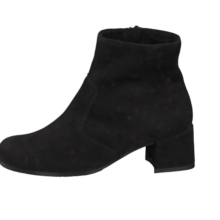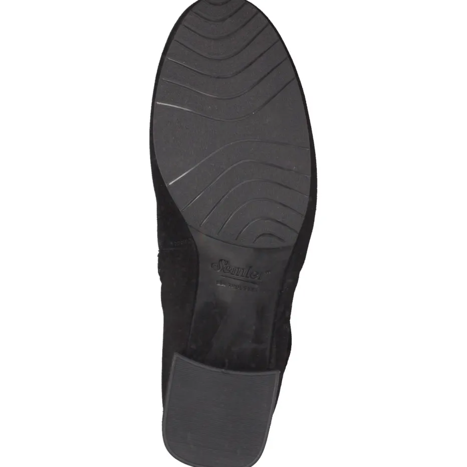 Stil trifft Funktion bei jedem Schritt.Semler präsentiert eine zeitlos elegante Damen-Stiefelette. Für stilvolle Büro-Tage oder entspannte City-Spaziergänge bietet diese klassische Ankle Boot-Silhouette aus hochwertigem, samtig mattiertem Veloursleder in Schwarz zuverlässigen Komfort. Dezente Ton-in-Ton-Nähte und ein unauffälliger Innenreißverschluss ergänzen das minimalistische Design nahtlos. Der mittelhohe Blockabsatz, kombiniert mit einer flexiblen und rutschhemmenden Gummisohle, schafft sicheren Stand bei urbaner Fortbewegung. Dank Textilfutter und herausnehmbarem Fußbett eignet sich das Modell auch für individuelle Einlagen. Harmoniert besonders gut mit geradliniger Businesswear oder casual Jeans-Looks. Semler sorgt für anspruchsvollen Tragekomfort mit stilvoller Zurückhaltung.