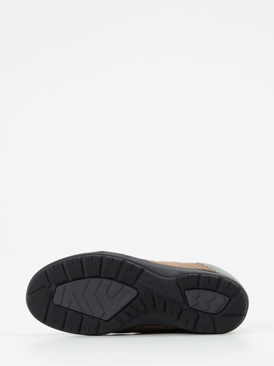 Stilvoll durch die kalte Jahreszeit.Semler präsentiert eine knöchelhohe Schnürstiefelette für Damen in komfortabler H-Weite. Ideal für Spaziergänge in der Natur oder urbane Ausflüge: Das weiche Veloursleder trifft auf einen strukturierten Schaft mit Mesh-Einsätzen in Strick-Optik. Die dominante mittelbraune Farbgebung harmoniert mit schwarzen Akzenten und einer zweifarbigen Schnürung im Bergsteiger-Stil. Ein innenliegender Reißverschluss sorgt für bequemes An- und Ausziehen, während die rutschhemmende PU-Profilsohle perfekten Grip bietet. Funktionalität und modischer Utility-Look verbinden sich zu einem stimmigen Gesamtbild im Gorpcore-Trend. Mit gepolstertem Wechselfußbett für zusätzlichen Komfort – Semler-typisch durchdacht.