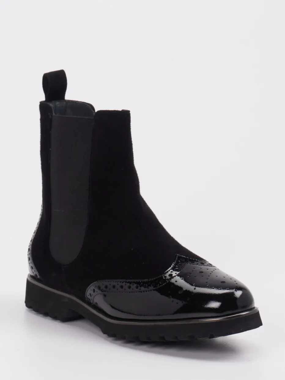 Diese Chelsea-Stiefelette von Sioux verbindet klassisches Design mit raffinierter Materialkombination. Ideal für Tage mit wechselnden Anforderungen – vom Büro bis zur Innenstadt. Das schwarze Veloursleder zeigt sich in samtiger Optik, akzentuiert durch glänzende Lackpartien an Spitze und Ferse. Brogue-Details und ein schmaler, knöchelhoher Schnitt betonen die elegante Silhouette, während der seitliche Elastikeinsatz und der innenliegende Reißverschluss Komfort garantieren. Die robuste Gummisohle verleiht Trittsicherheit und unterstützt den Heritage-Look mit „Quiet Luxury“-Appeal. Perfekt kombinierbar mit Wollmantel und Lederhandtasche. Hochwertige Verarbeitung und ausgewogene Form für souveräne Auftritte in Alltag und Business.