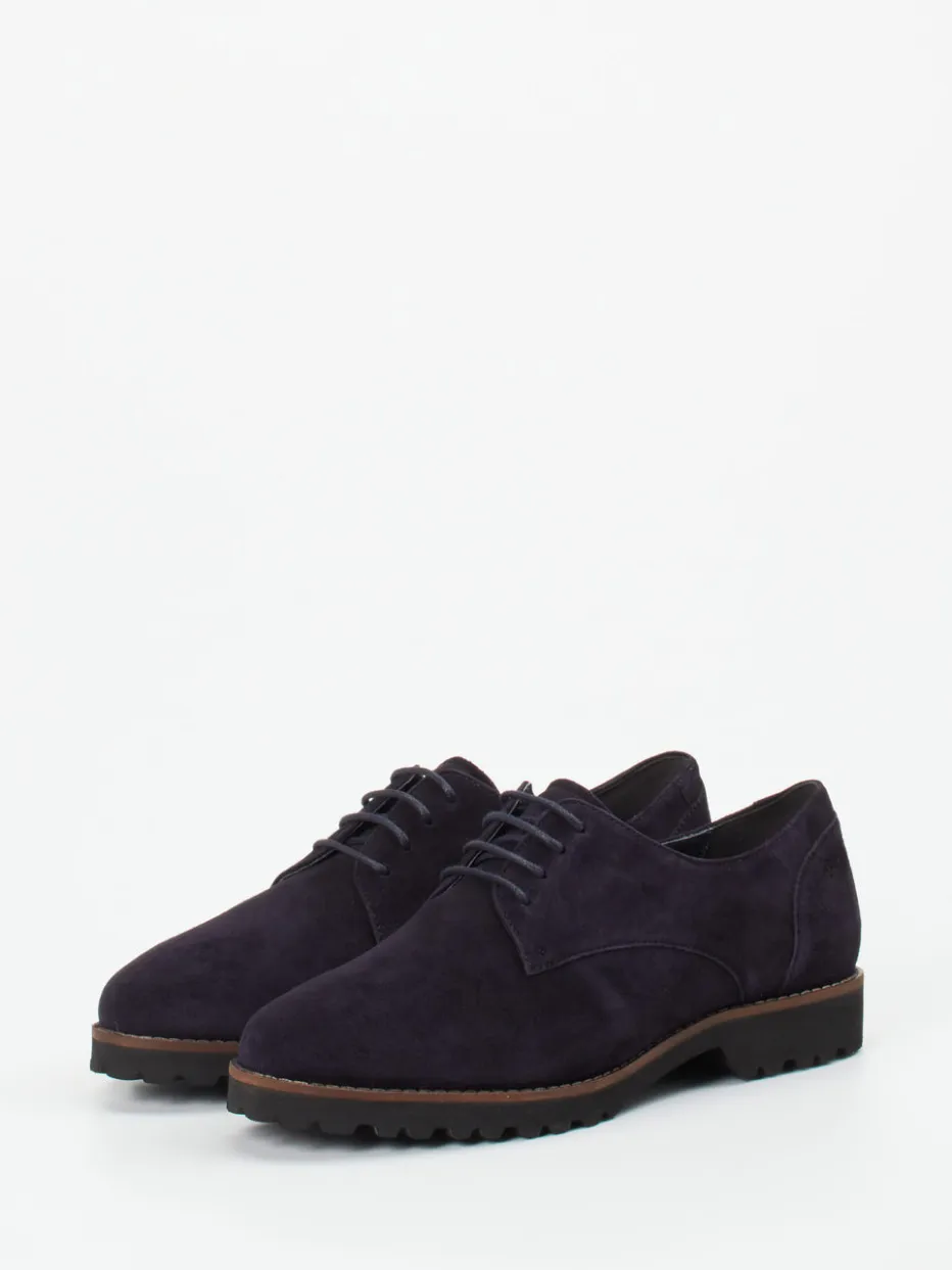 Perfekt für Büro und Alltag: Das geschmeidige Veloursleder mit samtiger Oberfläche trifft auf einen klassischen, flachen Schnitt in edlem Dunkelviolett. Die porosierte Gummisohle mit Profil sorgt für sicheren Tritt, auch bei nasser Witterung. Designfeatures wie 5-Loch-Schnürung und Ton-in-Ton-Nähte stärken den ruhigen Gesamteindruck im Sinne von „Quiet Luxury“. Dank Weite H und gepolstertem Wechselfußbett eignet sich das Modell auch für Einlagen. Kombiniert mit Strick oder feiner Wolle entsteht ein harmonischer Herbststil.