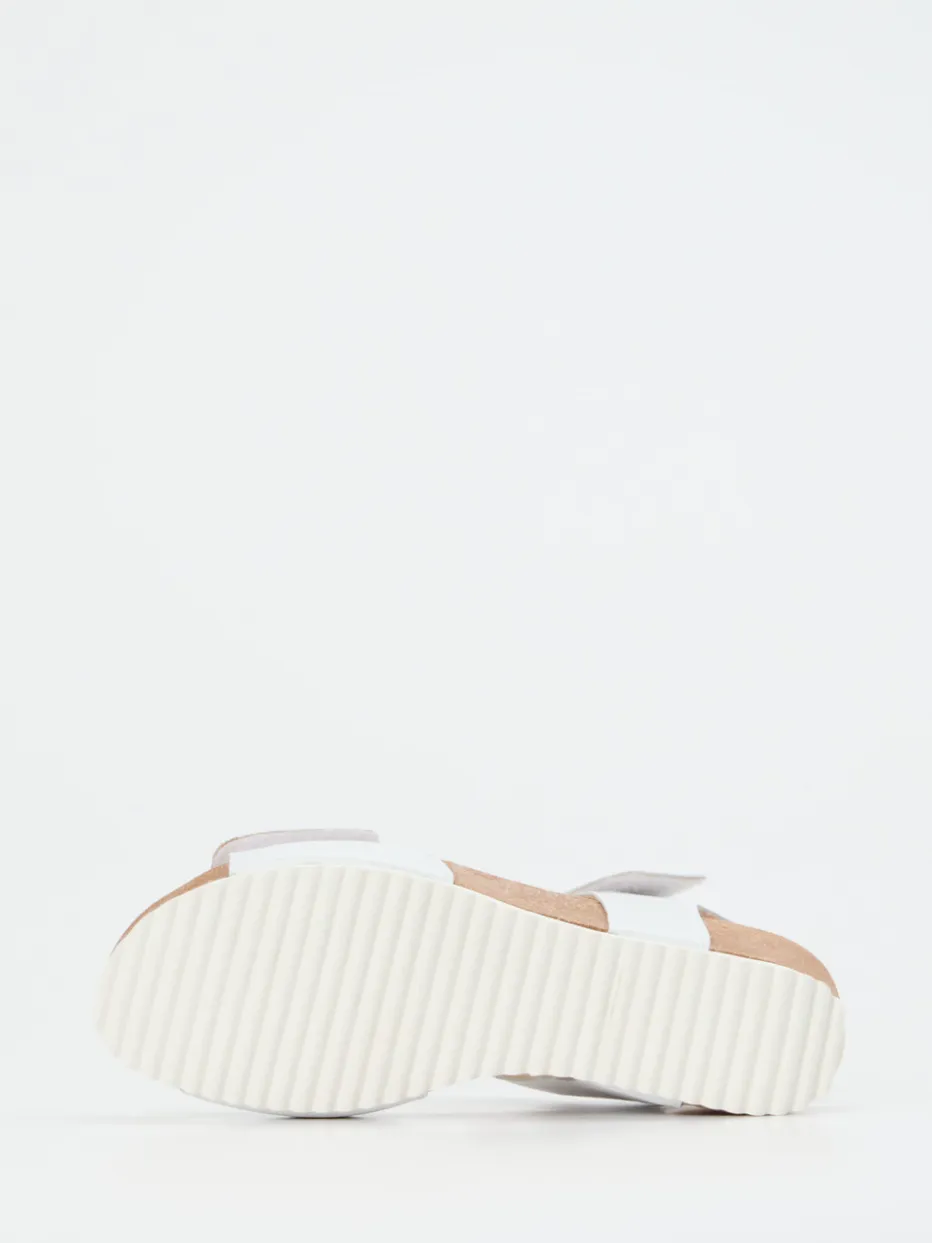 Diese komfortorientierte Keilsandale vereint hochwertiges Kalbleder in glänzender Optik mit einem ergonomisch geformten Kork-Fußbett – ideal für entspannte Sommertage.