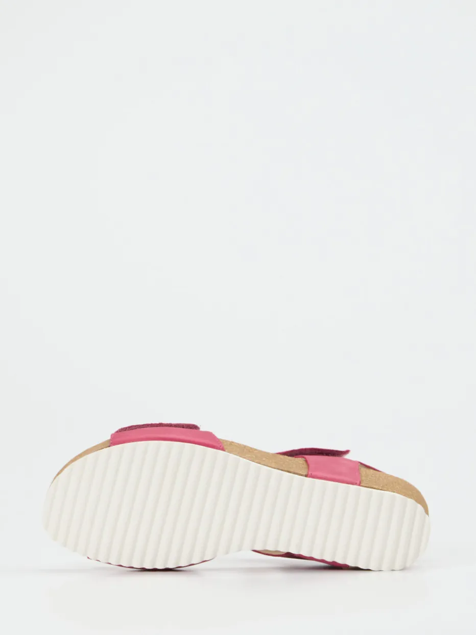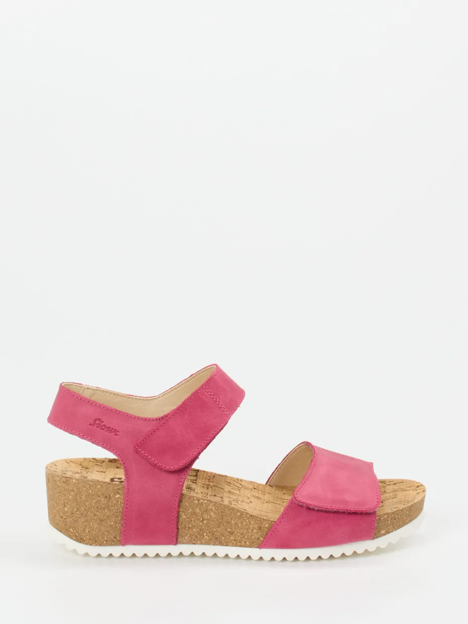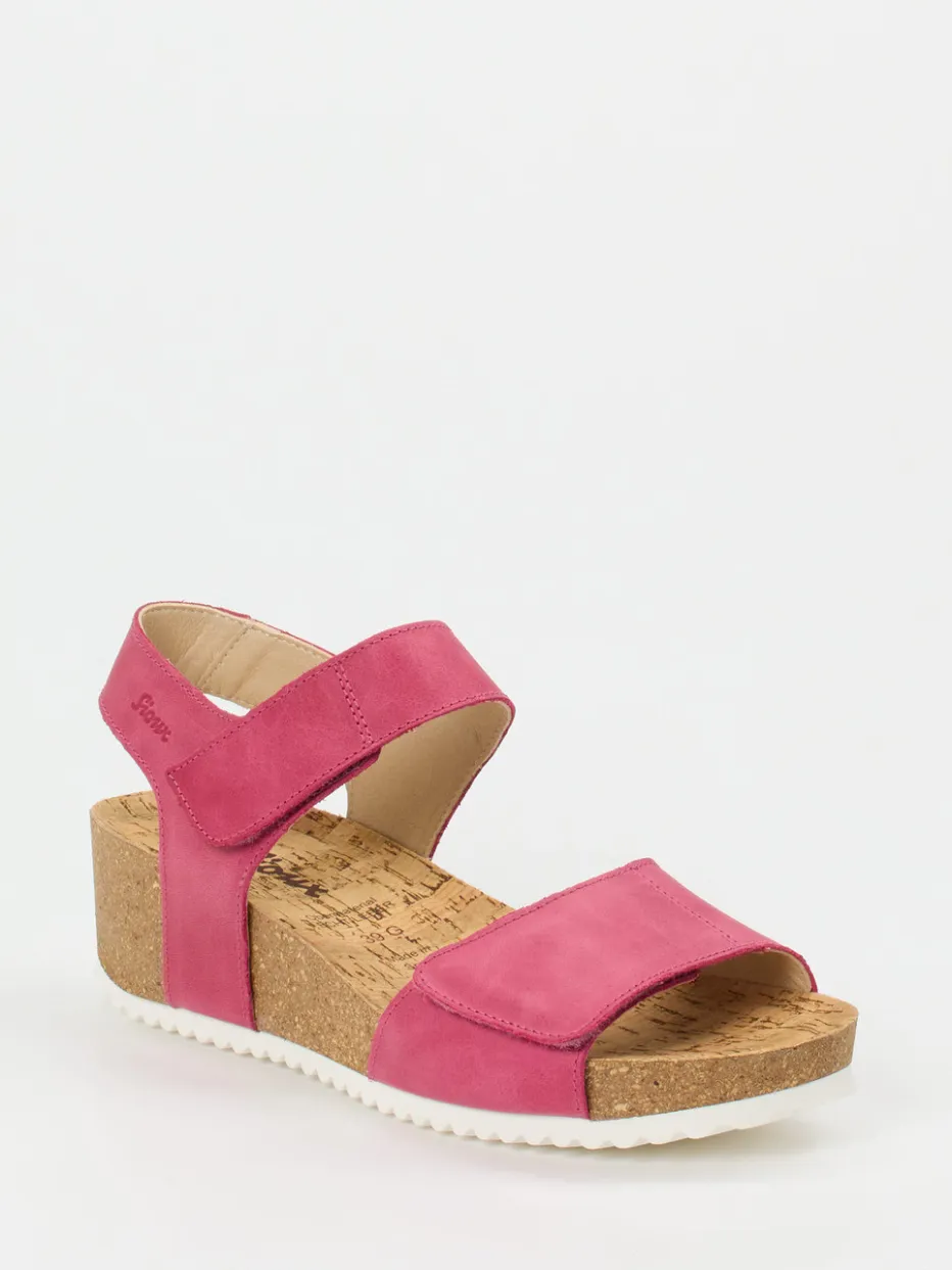 Sommerleicht und stabil zugleich.Die Marke Sioux zeigt bei dieser Damen-Komfortsandale stilvolle Alltagstauglichkeit. Das samtig-matte Kalbleder in frischem Himbeerrosa trifft auf einen offenen Schnitt mit dezenten Ton-in-Ton-Nähten. Zwei Klettverschlüsse ermöglichen eine flexible Passform, während das anatomisch geformte Korkfußbett angenehm stützt. Der leichte Keilabsatz auf weißer Profilsohle sorgt für Rutschfestigkeit und ergänzt den natürlichen Look. Ein geprägtes Markenlogo seitlich rundet das Erscheinungsbild ab. Perfekt zu luftigen Leinenhosen oder Sommerkleidern. Ein funktionales Design-Statement für entspannte Sommertage mit der Komfort-DNA von Sioux.