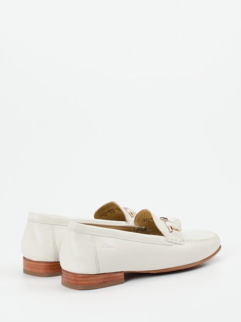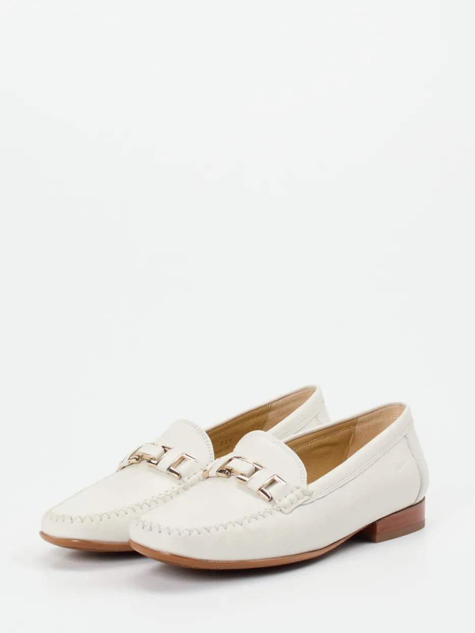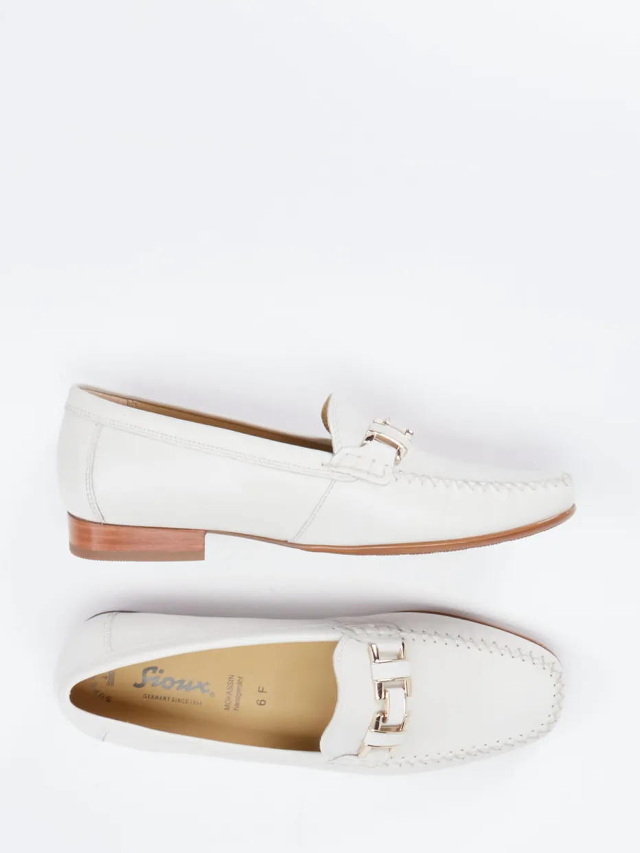 Stilvoll unterwegs – von Büro bis Café.Der Damen-Loafer von Sioux vereint klassisches Design mit modernem Finish. Perfekt für elegante Alltagsmomente bietet dieser Trotteur aus weißem Lammleder mit glatter Oberfläche eine hochwertige Basis für stilvolle Looks. Die goldfarbene Kettenspange auf dem Vorderblatt setzt einen dezenten Akzent, während die flache Silhouette mit Absatz in Holzoptik und die Gummisohle einen sicheren Auftritt garantieren. Das gepolsterte Super-Soft-Fußbett erhöht den Tragekomfort spürbar – ideal für lange Tage im Büro oder Freizeit. Kombiniert mit Stoffhose oder Midirock, entsteht ein ruhiger, gepflegter Look im Sinne des „Quiet Luxury“-Trends. Tradition und Handwerk verbinden sich bei Sioux zu langlebiger Qualität mit Komfortanspruch.