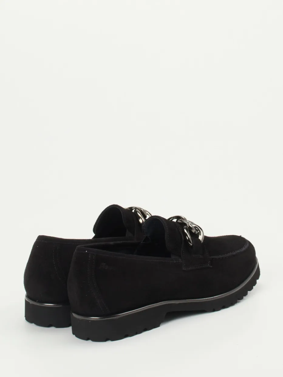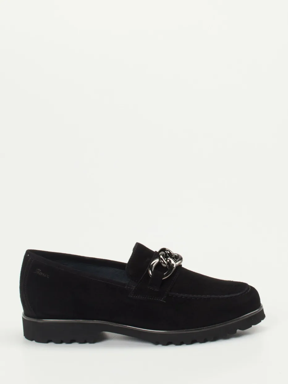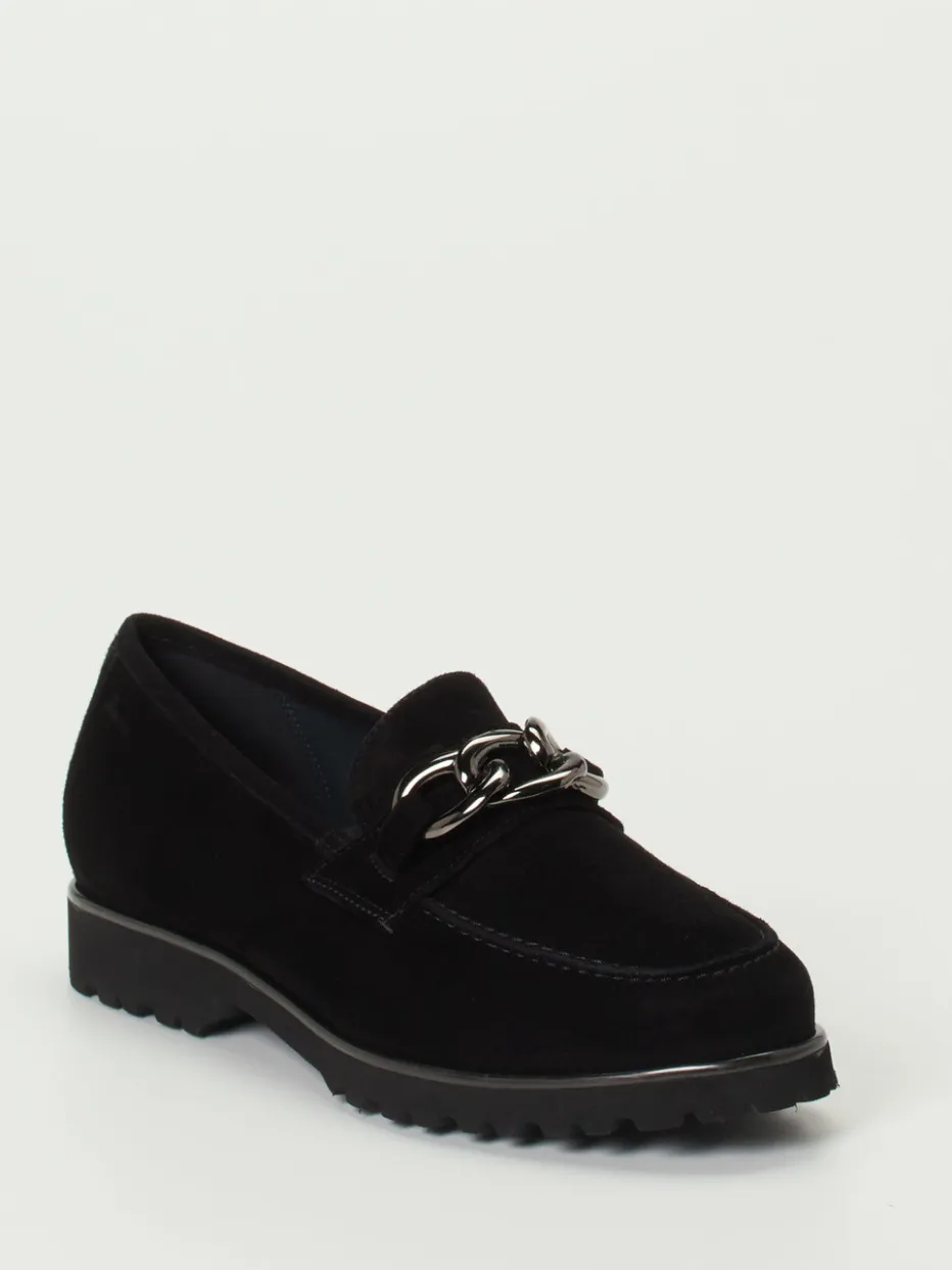 Dieser Damen-Loafer von Sioux kombiniert samtiges Veloursleder mit einer robusten Profilsohle und verleiht dem Klassiker durch das silberfarbene Kettendetail einen modernen Look.
