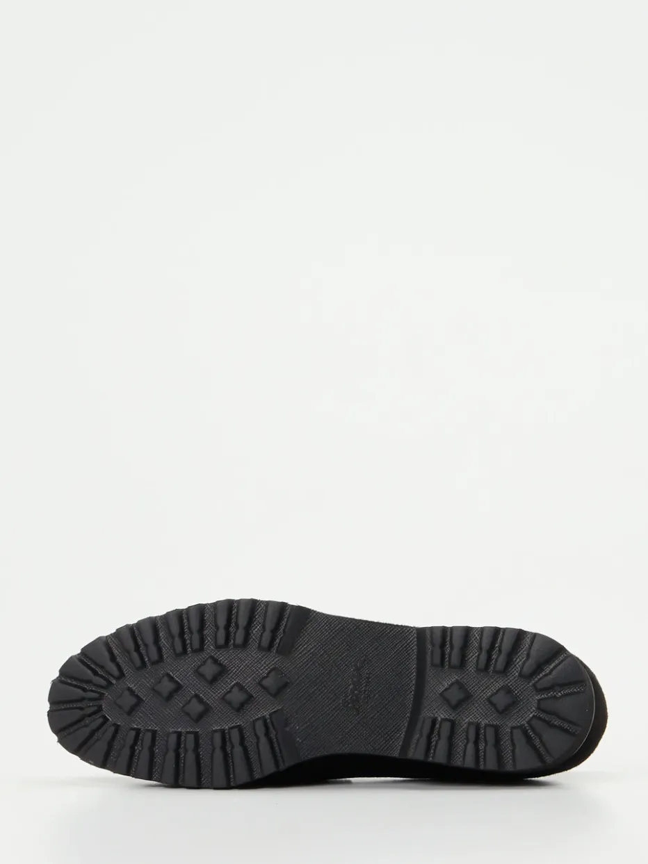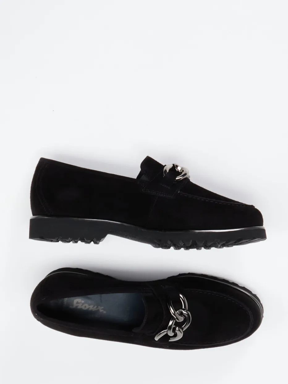 Modernes Understatement mit Stil.Die Marke Sioux bringt mit diesem Loafer einen eleganten Begleiter für Alltag und Business. Ob im Büro oder in der City – dieser schwarze Damen-Loafer erfüllt den Wunsch nach Komfort und modischer Aussagekraft. Gefertigt aus hochwertigem, samtig angeschliffenem Veloursleder zeigt er sich in klassisch flacher Silhouette mit betontem Rahmen. Die silberfarbene Gliederkette auf dem Blatt verleiht dem cleanen Design eine markante Note. Schlupfdesign und elastische Einsätze ermöglichen ein bequemes Anziehen, das weich gepolsterte Wechselfußbett sorgt für zusätzliche Bequemlichkeit. Die profilierte Gummisohle unterstreicht den aktuellen Chunky-Trend mit funktionalem Grip. Stilvoll zu Wollmantel und Ledertasche kombinierbar. Höchster Komfort in edler Ausführung – Qualität, wie man sie von Sioux kennt.