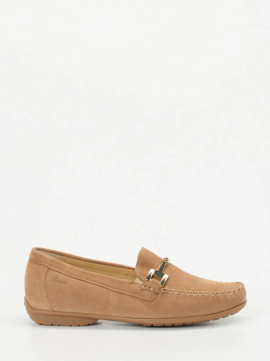 Für lange Tage im Büro oder einen stilvollen Stadtbummel bietet dieser Mokassin aus samtig angeschliffenem Veloursleder in Camelbraun einen idealen Begleiter. Mit seiner klassischen, flachen Silhouette setzt das Modell auf zeitlose Formgebung, ergänzt durch eine goldfarbene Trensengarnitur und markante Mokassinnaht. Die profilierte Gummisohle ist flexibel und sorgt zusammen mit der bequemen Weite H und dem herausnehmbaren Fußbett für ganztägigen Komfort – auch mit Einlagen. Stilistische Einflüsse aus dem Preppy-Trend und der Quiet-Luxury-Ästhetik unterstreichen seine moderne Wandelbarkeit.