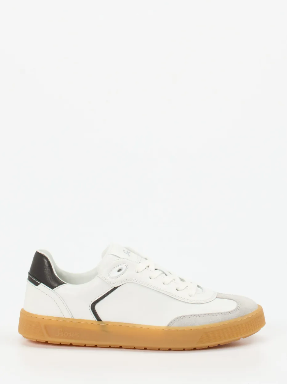 Für entspannte Alltagswege punktet das Modell mit weichem Kalbleder in Weiß, samtig angeschliffenem Veloursleder in Hellgrau sowie matten Oberflächen. Schwarze Details setzen dezente Akzente, die klassische flache Form ist sportlich und unkompliziert. Innen sorgt ein Frottee-Futter für ein angenehmes Fußklima, das weich gepolsterte Fußbett lässt sich bei Bedarf auswechseln. Die honigfarbene Gummisohle mit Retro-Flair ist besonders flexibel gearbeitet – ideal für stilbewusste Komfortliebhaber.