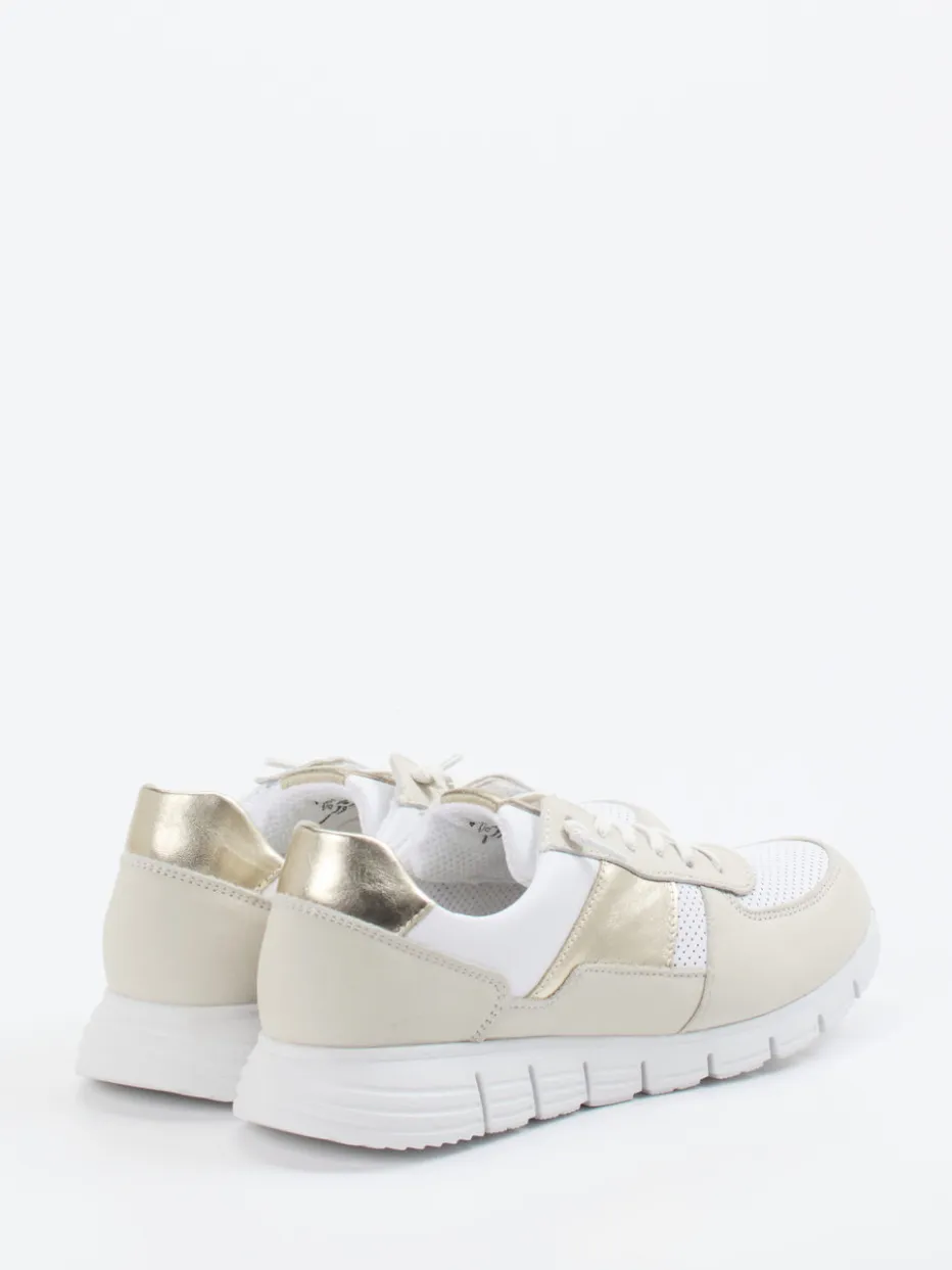 Sportiver Trend in Soft-Neutrals.Die Marke Sioux präsentiert mit diesem Sneaker ein Modell für Damen, das Minimalismus und Komfort vereint. Ideal für Freizeit, Reisen oder den Alltag in Bewegung: Das Modell kombiniert weiches Kalbleder mit perforierter Mesh-Oberfläche, ergänzt durch champagnergoldene Metallic-Einsätze. Die Farbpalette in Weiß und Beige wirkt hell und modern, die sportliche Silhouette erhält durch die klassische Schnürung und weich gepolsterte Elemente zusätzliche Komfortpunkte. Die griffige Gummisohle unterstützt ein sicheres Laufgefühl, während stilbewusste Akzente durch glänzende Details entstehen. Lässt sich hervorragend mit heller Denim oder Jogpants kombinieren. Eleganz, Tragekomfort und zeitgemäße Materialien – typisch Sioux.