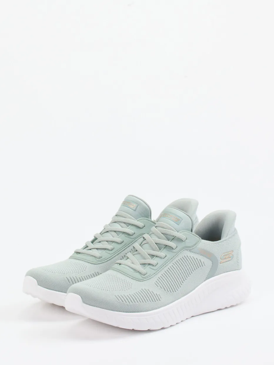 Sportlicher Komfort in Pastelltönen.Skechers präsentiert mit diesem Slip-On-Sneaker eine moderne Damenwahl für Alltag und Aktivität. Ideal für den Weg ins Fitnessstudio oder entspannte Alltagswege: Das fein strukturierte Meshtextil in zartem Pastellgrün bietet atmungsaktive Leichtigkeit. Die elastische Schnürung und ein gepolsterter Schaftrand erleichtern den Einstieg und verbessern den Halt. Eine ultraleichte Gummilaufsohle sorgt für sanftes Abrollen, während das atmungsaktive Memory-Foam-Fußbett ganztägigen Komfort garantiert. Dezente Ton-in-Ton-Nähte und ein metallicfarbenes Markenlogo betonen die minimalistische Ästhetik. Die Silhouette greift den aktuellen Athleisure-Trend auf und harmoniert perfekt mit Pastell-Trainingshosen oder leichten Freizeitoutfits. Ein femininer Allrounder mit funktionalem Anspruch von Skechers.