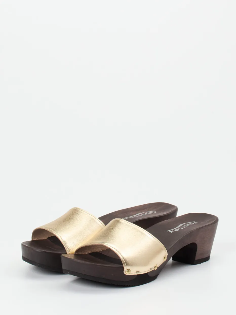 Statement in Gold und Holz.Die Damen-Clogs von Softclox verbinden modischen Anspruch mit natürlichem Materialgefühl. Ideal für warme Tage in der Stadt oder im Urlaub, kombinieren diese Pantoletten ein glänzendes Metallicleder in Gold mit einer sichtbaren Holzsohle. Der breite Spannriemen sorgt für sicheren Halt, während das integrierte Elast-Element zusammen mit dem abgestimmten Blockabsatz spürbaren Komfort bietet. Goldfarbene Nieten und ein offener trapezförmiger Schnitt verweisen stilvoll auf aktuelle Retro- und Metallic-Trends. Perfekt zu Leinenkleidern oder Culottes. Softclox setzt auf hochwertige Materialien mit alltagstauglichem Designkomfort.