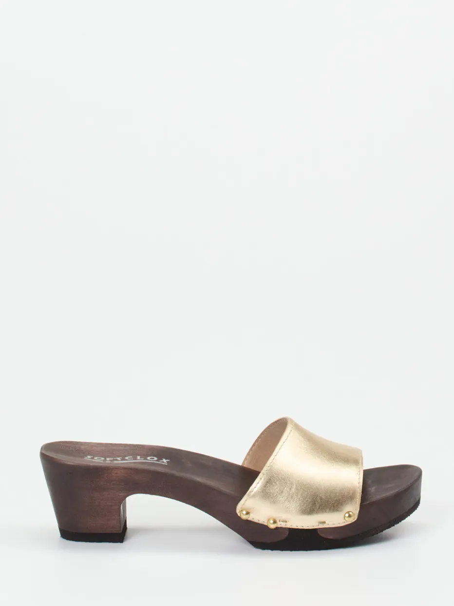 Ein gekonnter Stil-Mix aus 70s-Retro und modernem Metallic-Trend – komfortabel umgesetzt mit flexibler Holzsohle und weichem Leder.