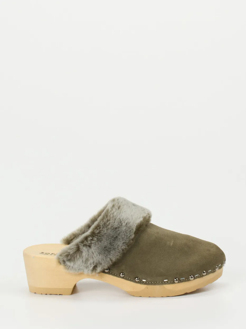 Softclox interpretiert klassische Damen-Clogs neu: aus samtigem Veloursleder in Olivgrün mit flauschigem Lammfellfutter für höchsten Komfort.