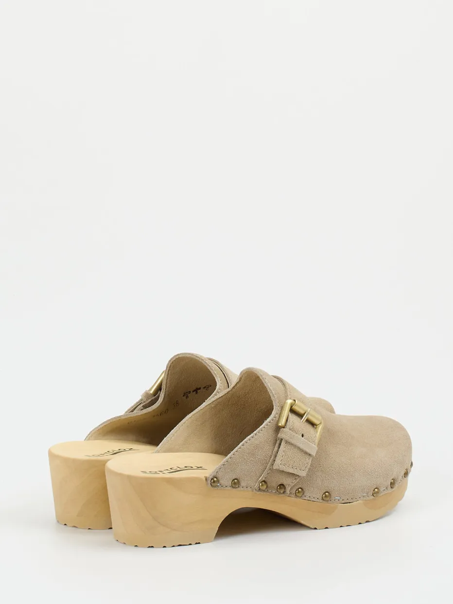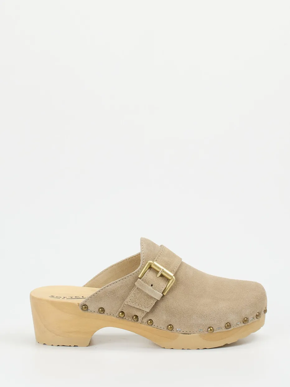 Puristische Ästhetik mit Komfortanspruch.Softclox präsentiert stilvolle Damen-Clogs mit ergonomischer Holzsohle und samtigem Veloursleder. Ideal für entspannte Tage im Alltag oder als ästhetischer Hausschuh: Das braune Veloursleder mit matter Oberfläche verleiht dem Modell eine dezente Eleganz. Die ergonomisch geformte Sohle aus Naturholz ist durch bronzefarbene Nieten akzentuiert und mit einem elastischen Flexeinsatz unter dem Ballen ausgestattet. Eine messingfarbene Schnalle sorgt für eine individuelle Passform. Der offen gehaltene Fersenbereich und die Gummisohle mit Profil bieten angenehme Luftigkeit und Rutschfestigkeit. Trendnah in der „Quiet Luxury“- und Craftcore-Ästhetik. Harmoniert ideal mit natürlichen Textilien für relaxte Freizeitmomente.