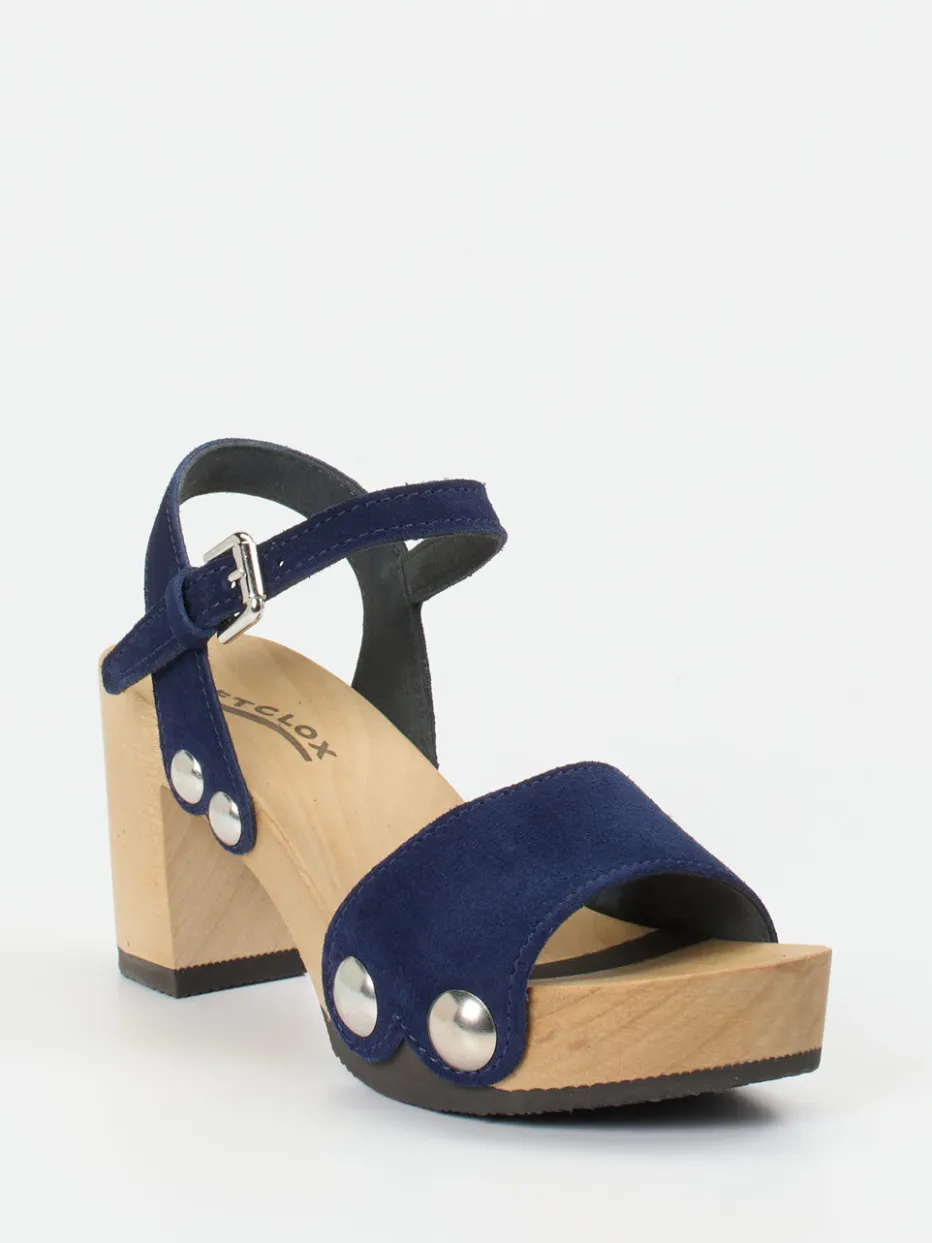 Der retro-inspirierte Look trifft auf Komfort: Marineblaues Veloursleder, Holzsohle und Blockabsatz vereinen sich zu einem trendstarken Sommermodell mit hohem Stilfaktor.