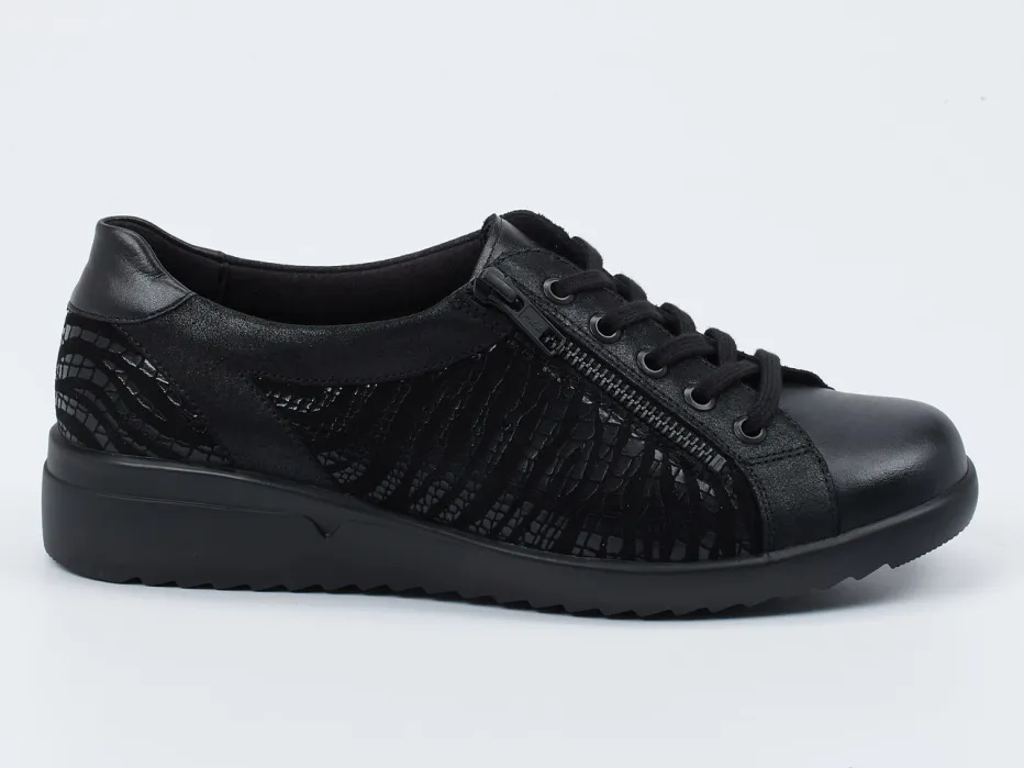 Mehr Struktur im Alltag.Die Marke Solidus präsentiert mit diesem Komfort-Sneaker ein Modell aus der beliebten Maren-Form. Ideal für langes Gehen oder entspanntes Unterwegssein im Alltag eignet sich dieses Damenmodell mit seitlichem Reißverschluss und bequemer Luftpolstersohle. Der Materialmix aus Kalbleder, samtig-schimmerndem Veloursleder und strukturiert geprägter Synthetik erzeugt in Schwarz ein raffiniert glänzendes Animal-Finish. Der rund geschnittene Sneaker mit toniger Schnürung vereint Casual-Look und durchdachte Komfortfunktionen. Die profilierte Gummisohle unterstützt bei jedem Schritt. Die auswechselbare Innensohle macht das Modell auch für Einlagetägerinnen ideal. Ein Solidus-Sneaker, der Alltagstrends mit wohltuender Funktion verbindet.