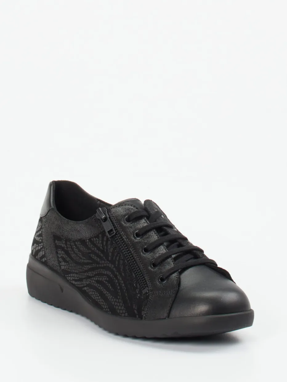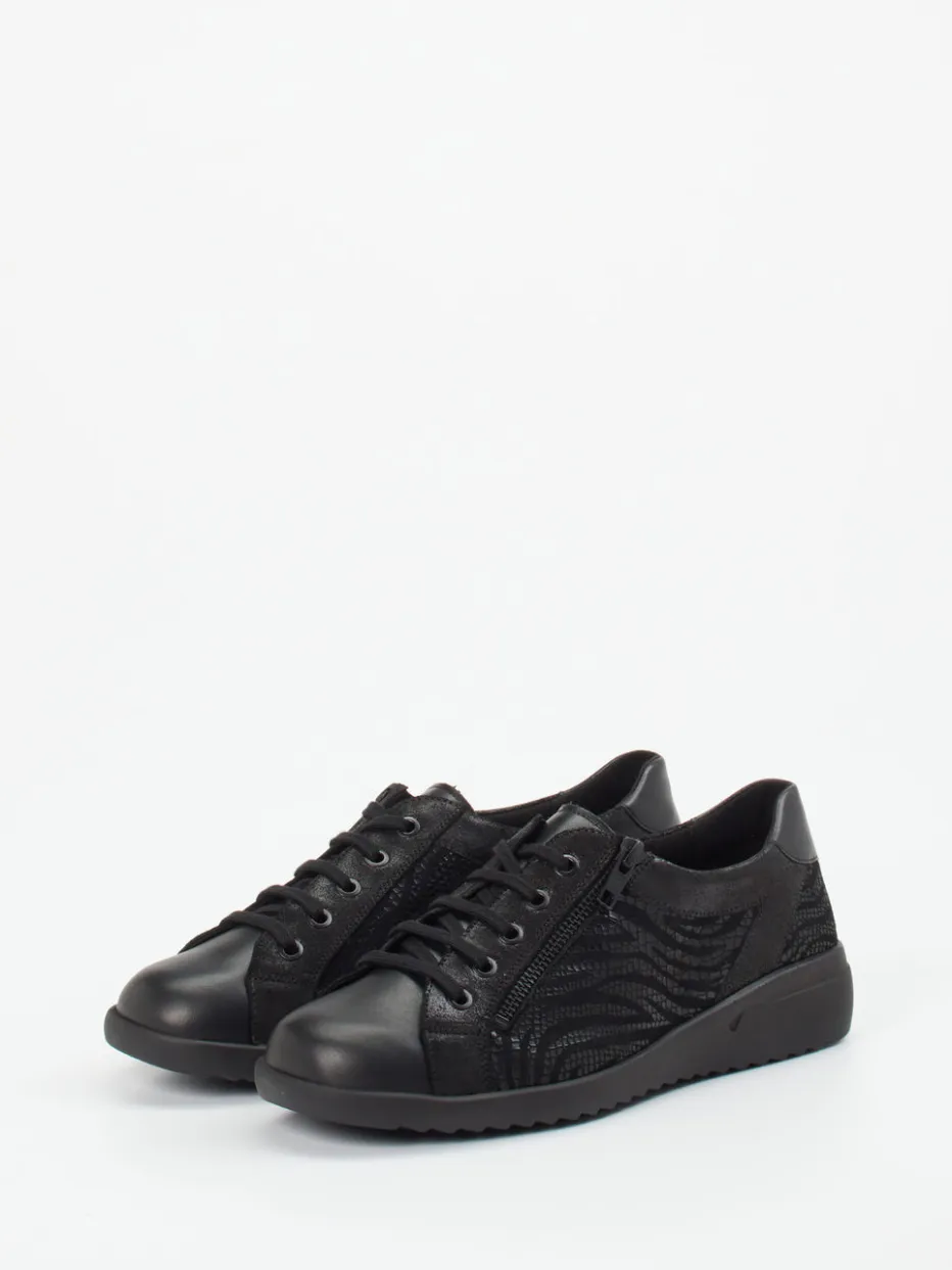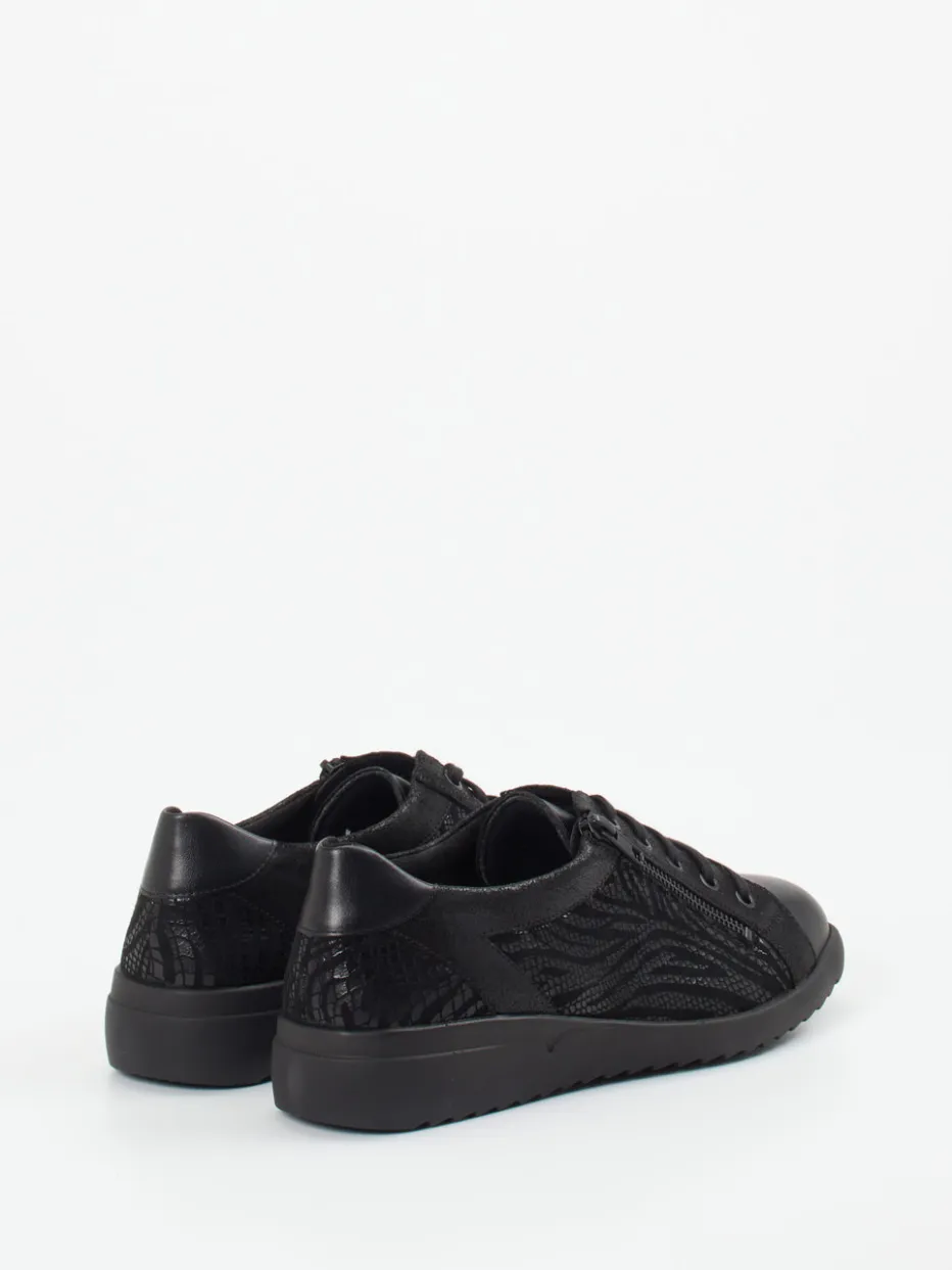 Struktur trifft Komfort.Solidus präsentiert mit diesem Komfort-Sneaker ein topaktuelles Modell für Damen. Perfekt für lange Tage auf den Beinen: Das hochwertige Kalbleder zeigt sich in einem Ton-in-Ton Look mit dezenter Animalstruktur und genarbter Oberfläche. Die schwarz gehaltene, klassische Low-Top-Silhouette vereint Schnürung mit seitlichem Reißverschluss für bequemes Anziehen. Eine profilierte Luftpolstersohle sorgt für Dämpfung und sicheres Auftreten. Der Materialmix greift stilvoll die Quiet-Luxury-Ästhetik auf und liegt damit im Trend. Stilvoller Alltagsbegleiter mit ergonomischem Mehrwert von Solidus.