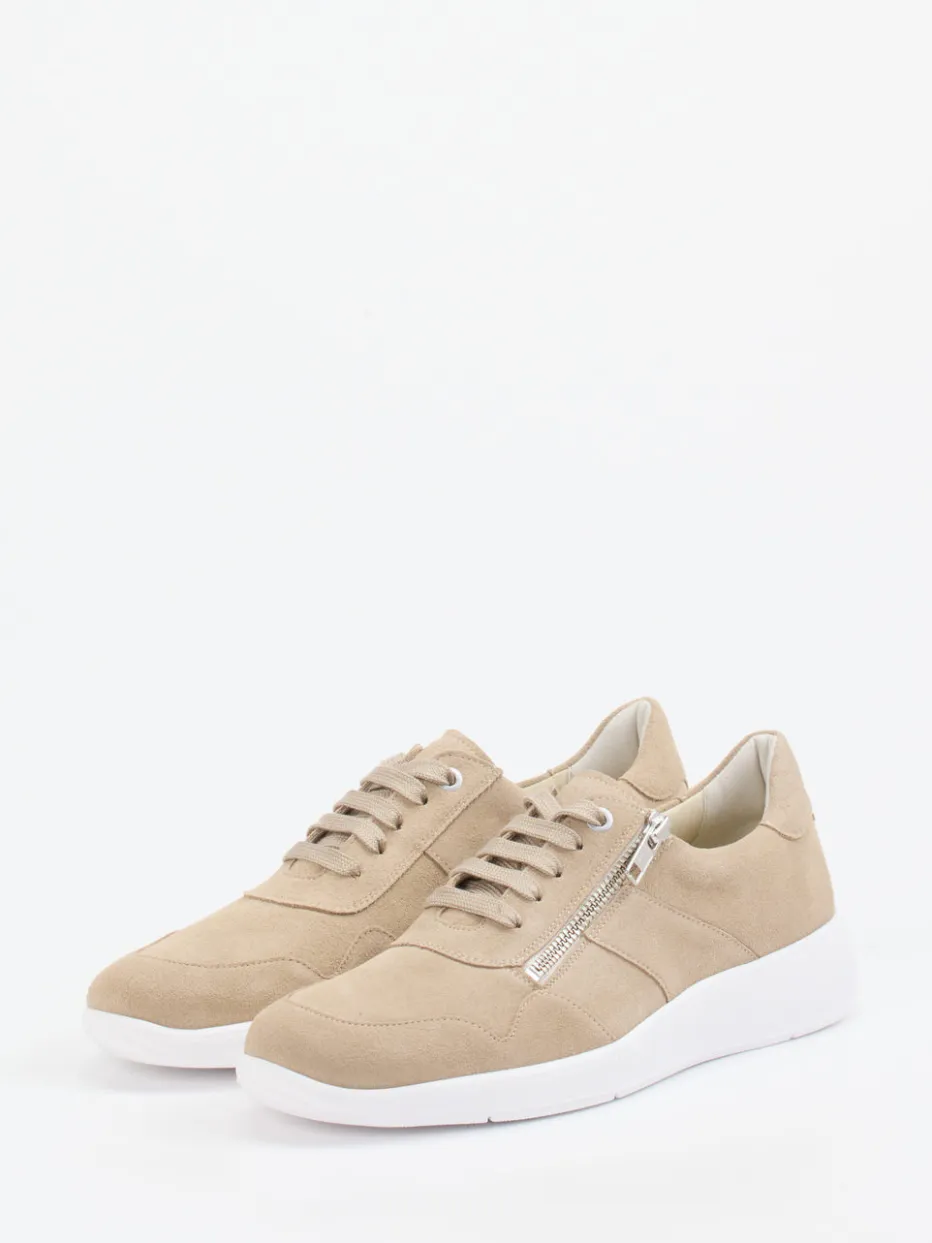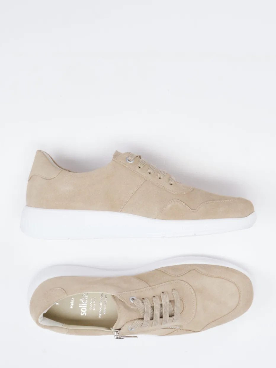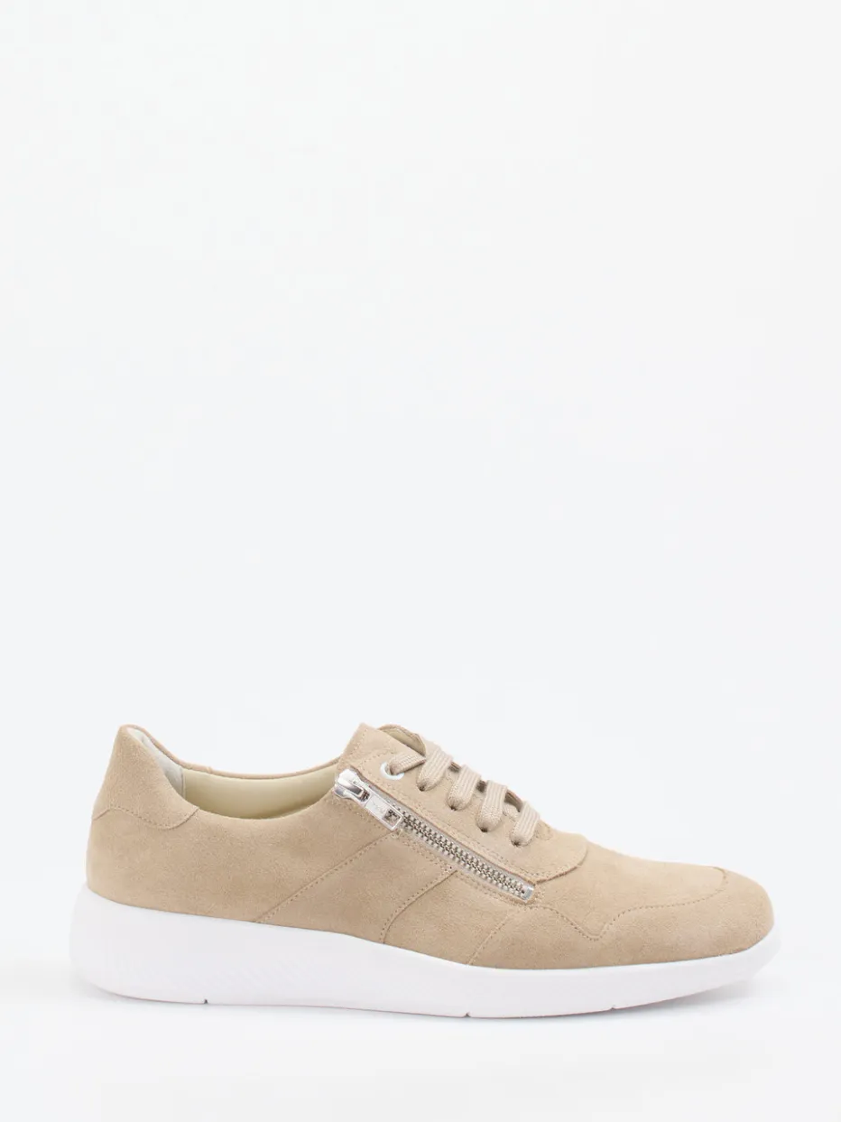Klassischer Komfort trifft modernes Design.Solidus präsentiert mit diesem beigen Komfort-Sneaker einen stilvollen Begleiter für Alltag und Freizeit. Sein samtig angeschliffenes Veloursleder überzeugt mit matter Oberfläche und Ton-in-Ton-Nähten. Die sportlich-abgerundete Silhouette trifft auf eine weiße Gummisohle mit rutschhemmendem Profil, während der seitliche Reißverschluss und die Schnürung ein unkompliziertes An- und Ausziehen ermöglichen. Silberfarbene Details runden den Look modern ab. Die Kombination aus Minimalismus und Soft-Neutrals macht ihn besonders vielseitig. Perfekt zu Cropped-Jeans und fließenden T-Shirts. Mit ergonomischer Leichtlaufsohle und F-Weite bietet Solidus spürbaren Komfort bei jedem Schritt.