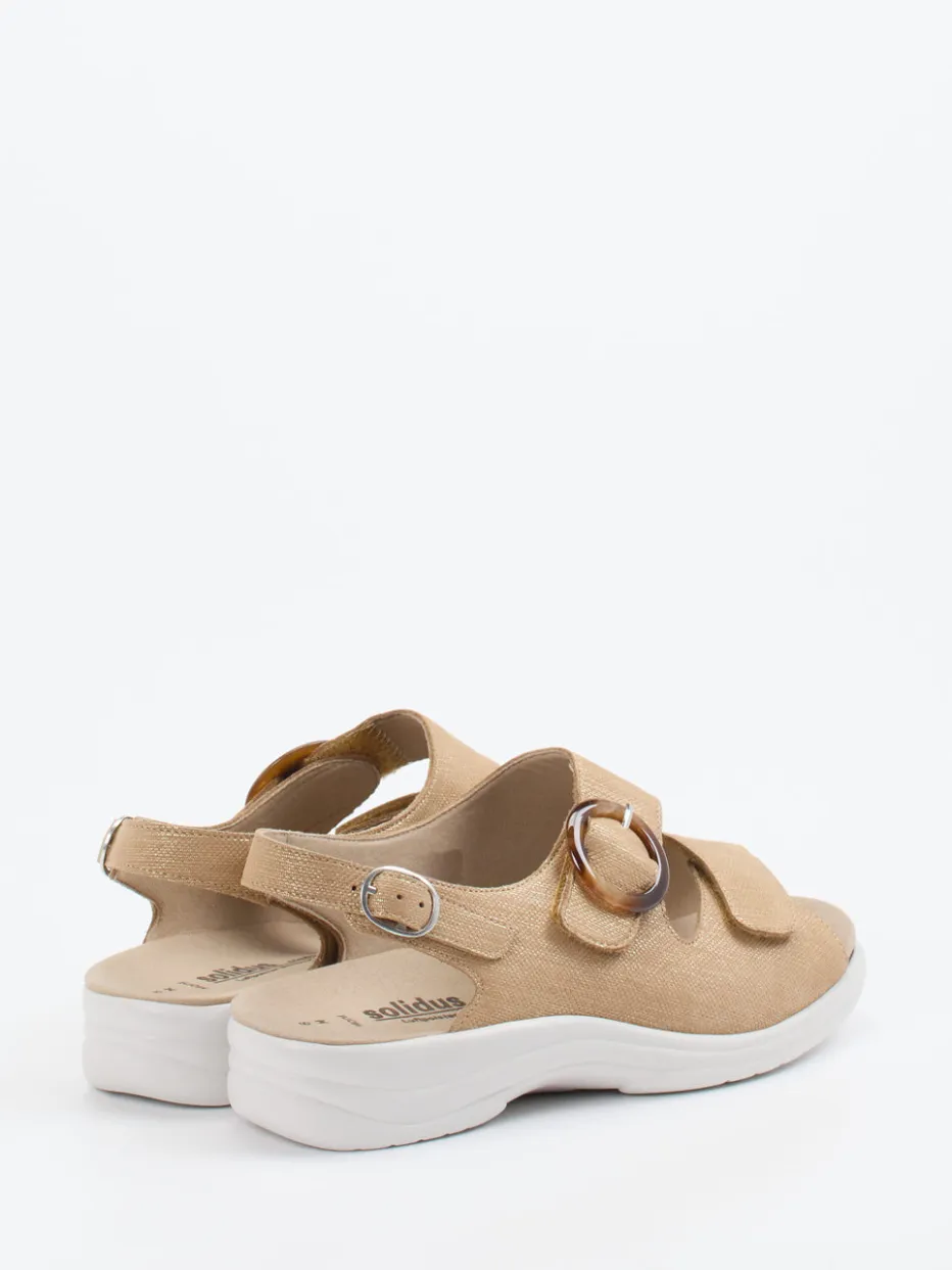 Minimalismus trifft Tragekomfort.Diese Komfortsandale von Solidus überzeugt durch funktionale Details und ein dezentes Design. Für entspannte Sommertage bietet das Modell maximalen Komfort: Das beige Obermaterial aus geprägtem Leder mit leicht strukturierter Oberfläche harmoniert mit der offen gehaltenen Silhouette. Die ergonomische Form unterstützt den Fuß, während Klettverschlüsse und ein verstellbarer Fersenriemen eine individuelle Passform ermöglichen. Die PU-Sohle sorgt für ein leichtes Laufgefühl, das herausnehmbare Fußbett eignet sich für orthopädische Einlagen. Dezente Designakzente wie die silberfarbene Schnalle in Hornoptik unterstreichen die stilvolle Reduktion. Ein entspannter Wohlfühlschuh mit klarer Formsprache – Solidus-typisch komfortbetont.