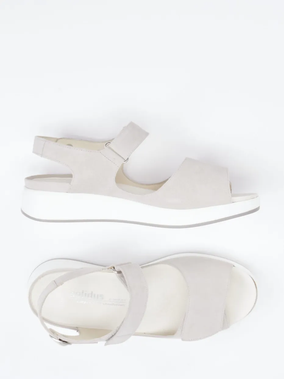 Bequem durch den Sommer.Solidus präsentiert mit dieser Komfortsandale eine stilvolle Begleiterin für Alltag und Freizeit. Die Sandale überzeugt durch ihr softes Veloursleder mit matter Oberfläche in Helltaupe, ergänzt um ein atmungsaktives Lederfutter. Die offene Silhouette mit ergonomischer Keilsohle ermöglicht entspanntes Gehen, während Klettverschlüsse und ein zusätzlicher Fersenriemen mit silberfarbener Schnalle optimalen Halt bieten. Dezente Ton-in-Ton-Nähte und eine rutschhemmende Gummisohle unterstreichen das minimalistische Design. Teil der Soft Neutrals SS24-Trendwelt, passend für komfortaffine Looks. Lässt sich hervorragend zu Leinenblusen und hellen Sommerhosen kombinieren. Solide Markenqualität von Solidus – für anspruchsvolle Füße mit Stilanspruch.