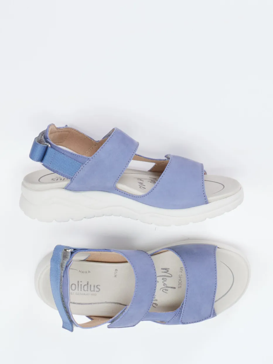 Funktion trifft Komfort – ideal für Alltag und Reise.Solidus präsentiert bequeme Komfortsandalen für Damen. Ob beim Stadtbummel oder auf Reisen – diese Sandalen in jeansblauem Nubukleder bieten mit drei Klettverschlüssen optimalen Halt und eine passgenaue Weitenregulierung. Das samtig angeschliffene Leder und die matte Oberfläche verleihen einen funktional-zurückhaltenden Stil. Die profilierte Gummisohle sorgt für sicheren Tritt, das gepolsterte, ergonomisch geformte Wechselfußbett in Weite H unterstützt mühelos ganztägigen Komfort. Minimalistische Linienführung und Ton-in-Ton-Nähte betonen den relaxed-eleganten Look. Harmonisch zu Caprihosen und luftigen Blusen kombinierbar. Ein durchdachtes Komfortmodell – typisch Solidus Qualität.