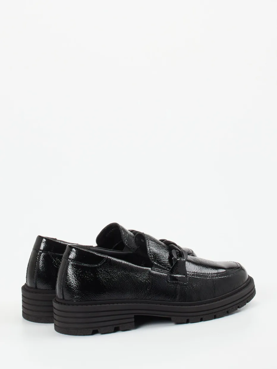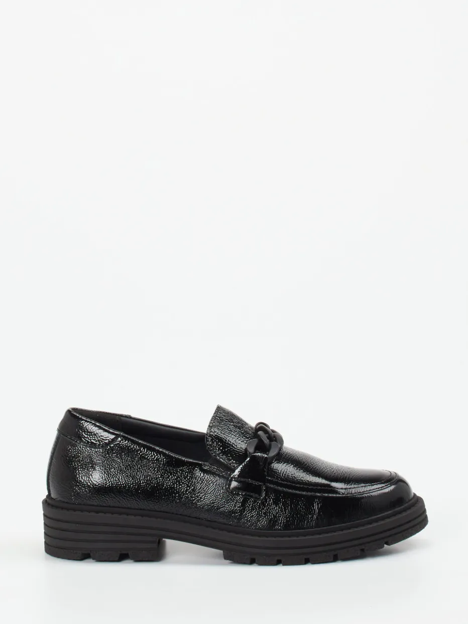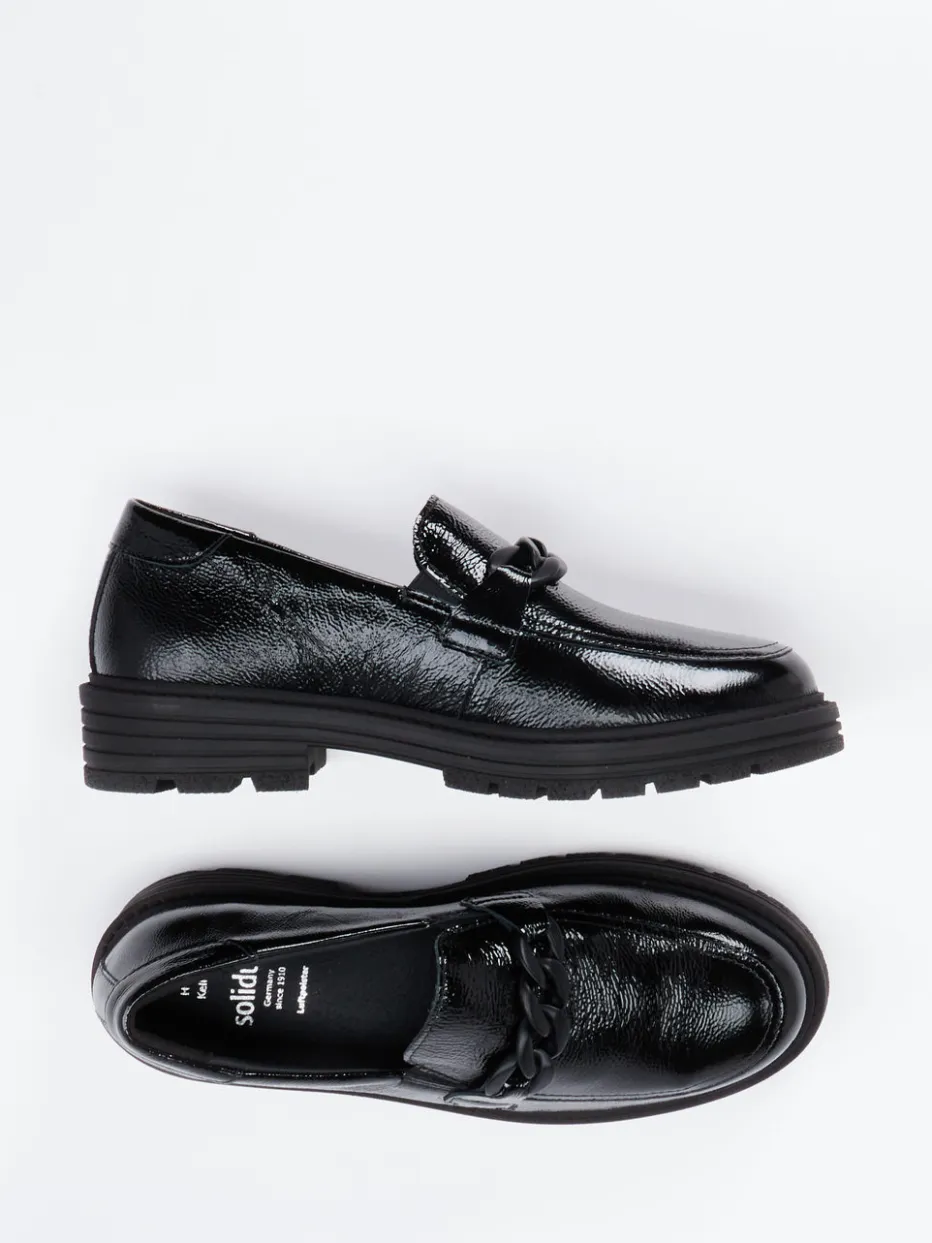 Minimalistisches Statement mit Glanzfaktor.Solidus präsentiert mit diesem Slipper ein stilvolles Modell aus der Bequemlinie, das Komfort und Design vereint. Für urbane Looks zwischen Büro und Freizeit bietet der Slipper aus schwarzem Lackleder eine glänzende Bühne. Die klassische Loafer-Silhouette wird mit einer robusten, rutschfesten Profilsohle kombiniert, die sicheren Halt garantiert. Eine matt-glänzende Kunststoffkette in Ton-in-Ton-Optik unterstreicht den minimalistischen Streetwear-Einfluss. Die bequeme Weite K sowie das herausnehmbare Fußbett sorgen für persönlichen Tragekomfort und machen diesen Chunky Loafer zum idealen Begleiter für anspruchsvolle Stylingkonzepte. Solidus steht für stilvolle Passform mit modernem Komfortanspruch.