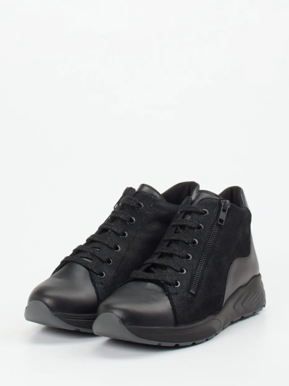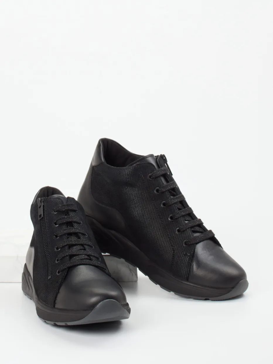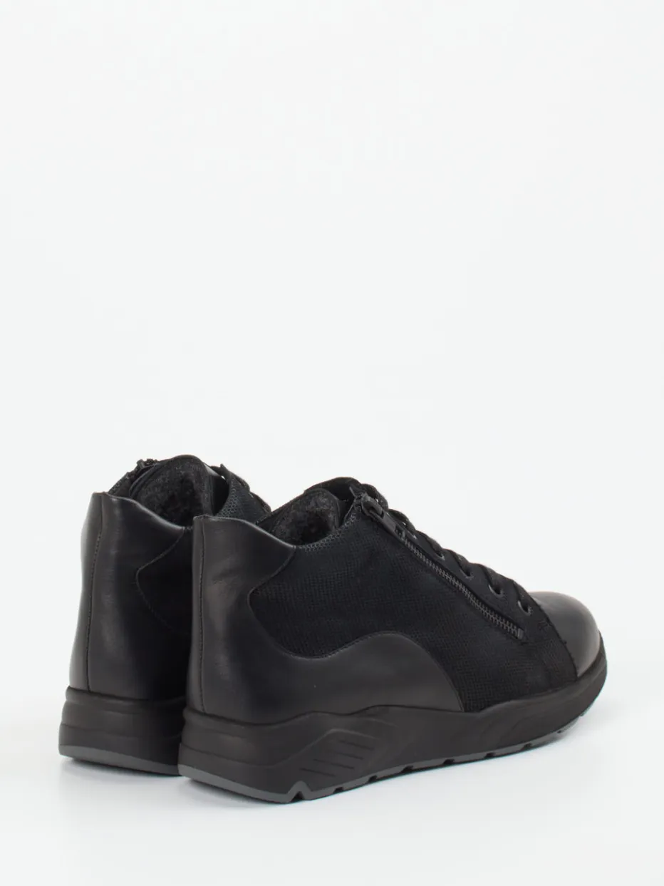 Ideal für den Alltag bietet dieses Modell mit geprägtem Leder, glatten Partien und strukturiertem Mesh einen ausbalancierten Materialmix. Akzentuiert wird das schwarze Design durch tonale Reißverschlüsse und glitzernde Schnürsenkel. Die Gummisohle mit rutschfester Struktur unterstützt eine natürliche Abrollbewegung, während das wollgefütterte Innere Wärme und Bequemlichkeit garantiert. Dank Reißverschluss ist der Einstieg besonders einfach. Perfekt kombinierbar mit urbanen Relax-Looks oder schlichten Freizeit-Outfits.