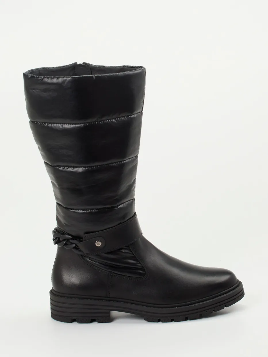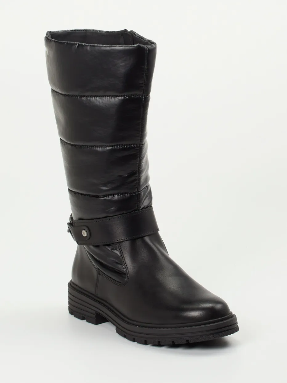 Wintertauglich und durchdacht designt.Die Marke Solidus präsentiert mit diesen Winterstiefeln eine zeitgemäß interpretierte Stiefelette für kalte Tage. Ein perfekter Begleiter für den urbanen Alltag bei winterlichen Bedingungen: Das Obermaterial kombiniert schwarzes Kalbleder im Fußbereich mit einem matt-glänzenden, gesteppten Nylon-Schaft. Ein seitlicher Reißverschluss vereinfacht den Einstieg, während dekorative Riemen mit Kette und Zierknopf den funktionalen Look aufwerten. Die rutschfeste Profilsohle aus Gummi und das herausnehmbare Kork-Fußbett mit Luftpolster sorgen für sicheren, langanhaltenden Tragekomfort. Inspiriert von Streetwear und Utility-Trends passt das Modell ideal zu schwarzen Steppjacken oder Thermoleggings. Solidus steht für ergonomischen Komfort in modernem Design – auch an eisigen Tagen.