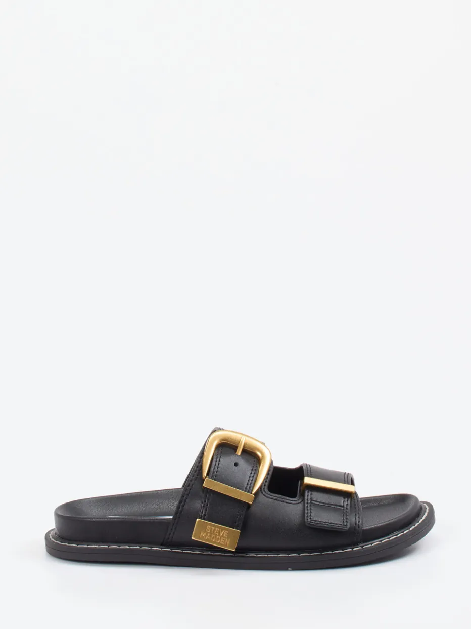 Diese Steve Madden Slides kombinieren veganes Synthetikleder mit stilprägenden Goldakzenten zu einem klaren Statement urbaner Sommermode.