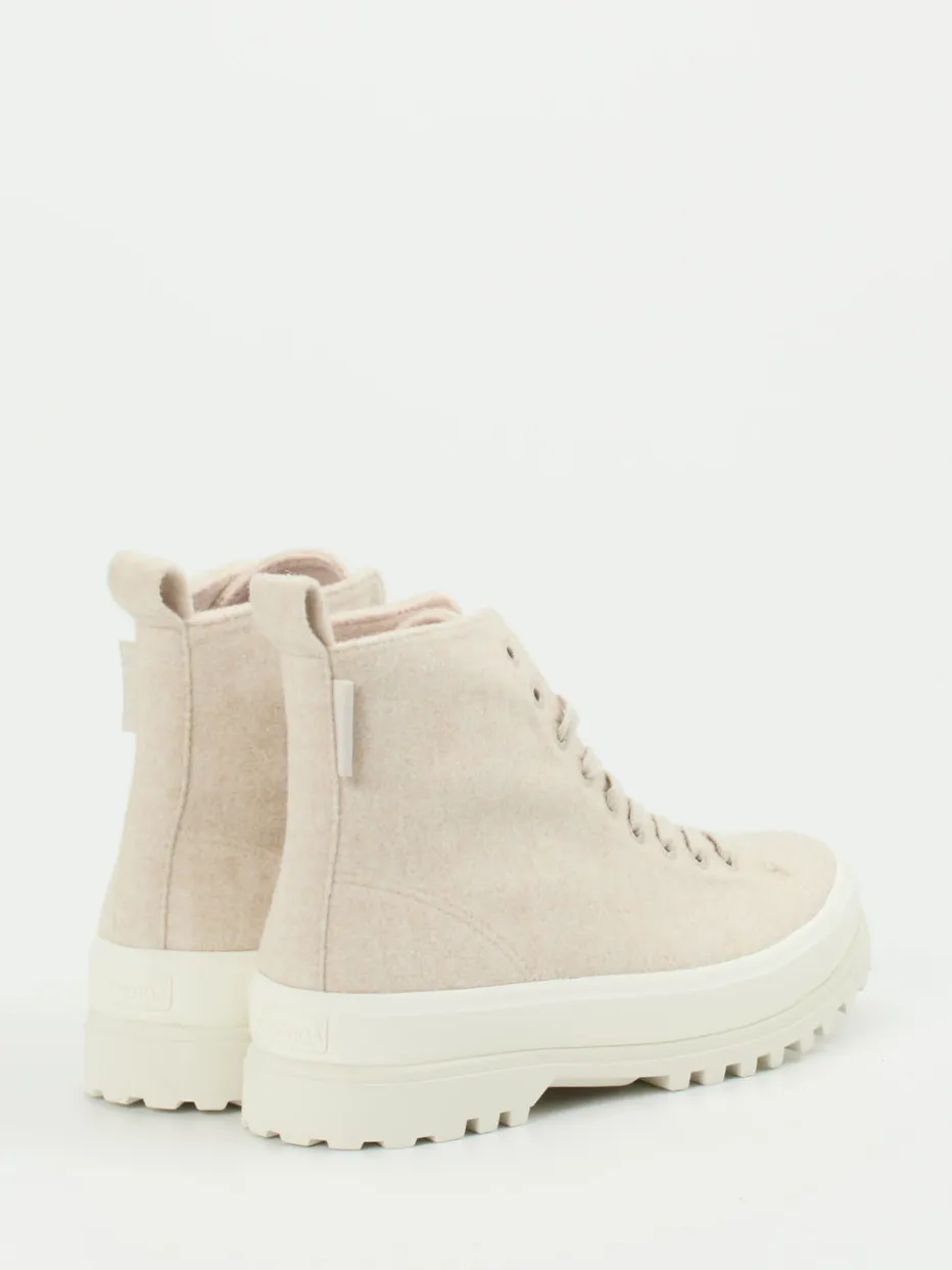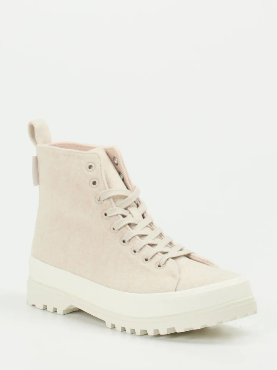 Minimalismus für urbane Herbsttage.Superga präsentiert mit diesen High-Top-Schnürboots ein stilbewusstes Damenmodell für die kühle Jahreszeit. Ob beim Spaziergang durch den Park oder auf dem Weg ins Büro – die weiche, strukturierte Filz-Oberfläche in hellem Cremebeige bietet nicht nur visuelle Wärme, sondern auch angenehmen Tragekomfort. Die tonige Schnürung, ein gepolstertes, herausnehmbares Fußbett und die kräftig profilierte Gummisohle schaffen alltagstaugliche Funktionalität. Die dezente Silhouette mit Zuglasche hinten und der monochrome Look unterstreichen den urban-relaxeden Charakter und greifen den Scandi-Basics-Trend gekonnt auf. Besonders schön: das kontrastierende pinke Innenfutter aus weichem Textil. Ein authentischer Begleiter für modische Streetwear-Momente mit Komfortfaktor.
