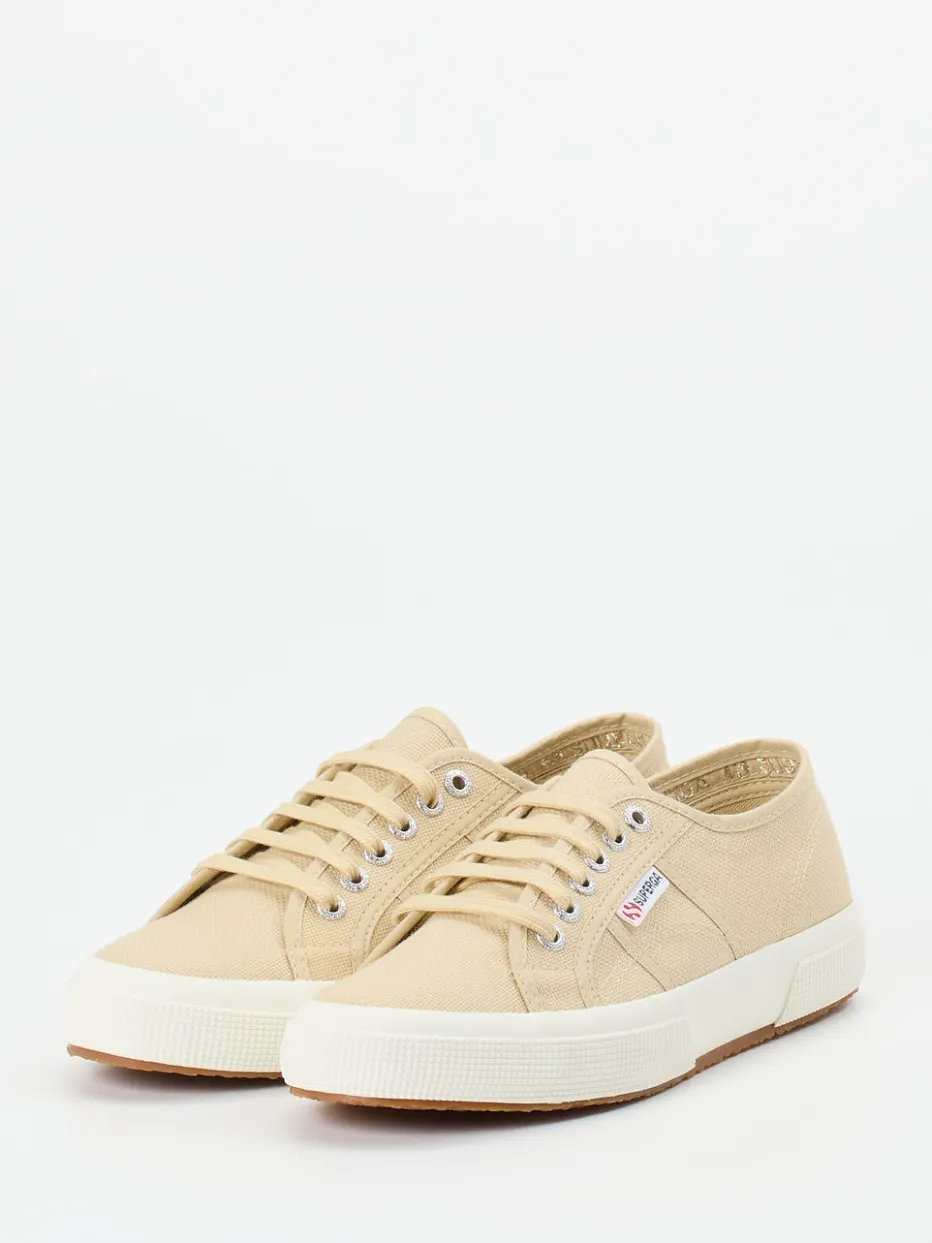 Schlichtes Statement mit Struktur.Die Marke Superga stellt mit diesem Sneaker ein modisches Basic vor, das sich sowohl für den Alltag als auch für entspannte Momente im Urlaub eignet. Das textile Obermaterial aus Baumwoll-Canvas wirkt durch die matte Oberfläche und die dezente beigetönige Farbgebung besonders natürlich. Die klassische, flache Silhouette mit silberfarbenen Metallösen, toniger Schnürung und vulkanisierter weißer Gummisohle spiegelt zeitlosen Komfort wider. Logo-Details an Ferse und Außenseite setzen dezente Markenakzente. Dieser Unisex-Sneaker passt perfekt zu leichten Naturtönen und steht im Zeichen aktueller „Quiet Luxury“- und „Natural Tones“-Trends. Superga kombiniert Funktionalität und Ästhetik zu einem Sneaker mit klarer Handschrift.