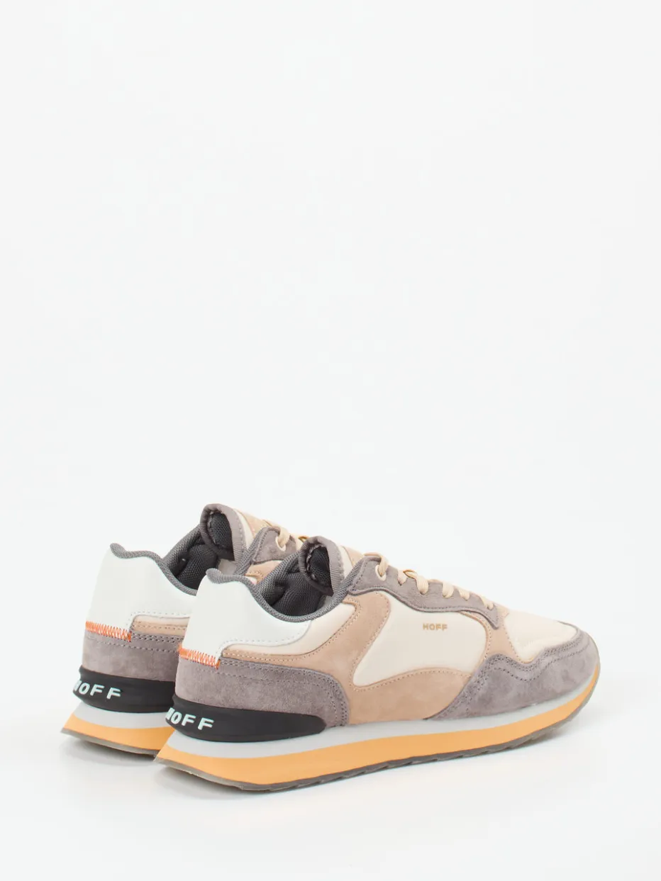 Optisches Highlight mit urbanem Charakter.THE HOFF BRAND verbindet Retro-Flair mit modernem Design in dieser Sneaker-Kreation. Ideal für entspannte Tage in der City: Der Retro-Sneaker kombiniert samtig angeschliffenes Veloursleder mit leichtem Textil und Glattlederimitat. Die cremebeige Grundfarbe wirkt mit Akzenten in Taupe und Sand besonders harmonisch. Stilprägend sind die klassische flache Silhouette, die helle Schnürung und die transparente Außensohle mit Stadtgrafik „PUEBLA“. Polsterung am Schaft sorgt für Komfort im Alltag. Inspiriert von Streetwear und dem 90s-Revival passt das Modell zu Jogpants und Oversize-Hoodies. Trendorientierter Look mit dynamischer Markenidentität.