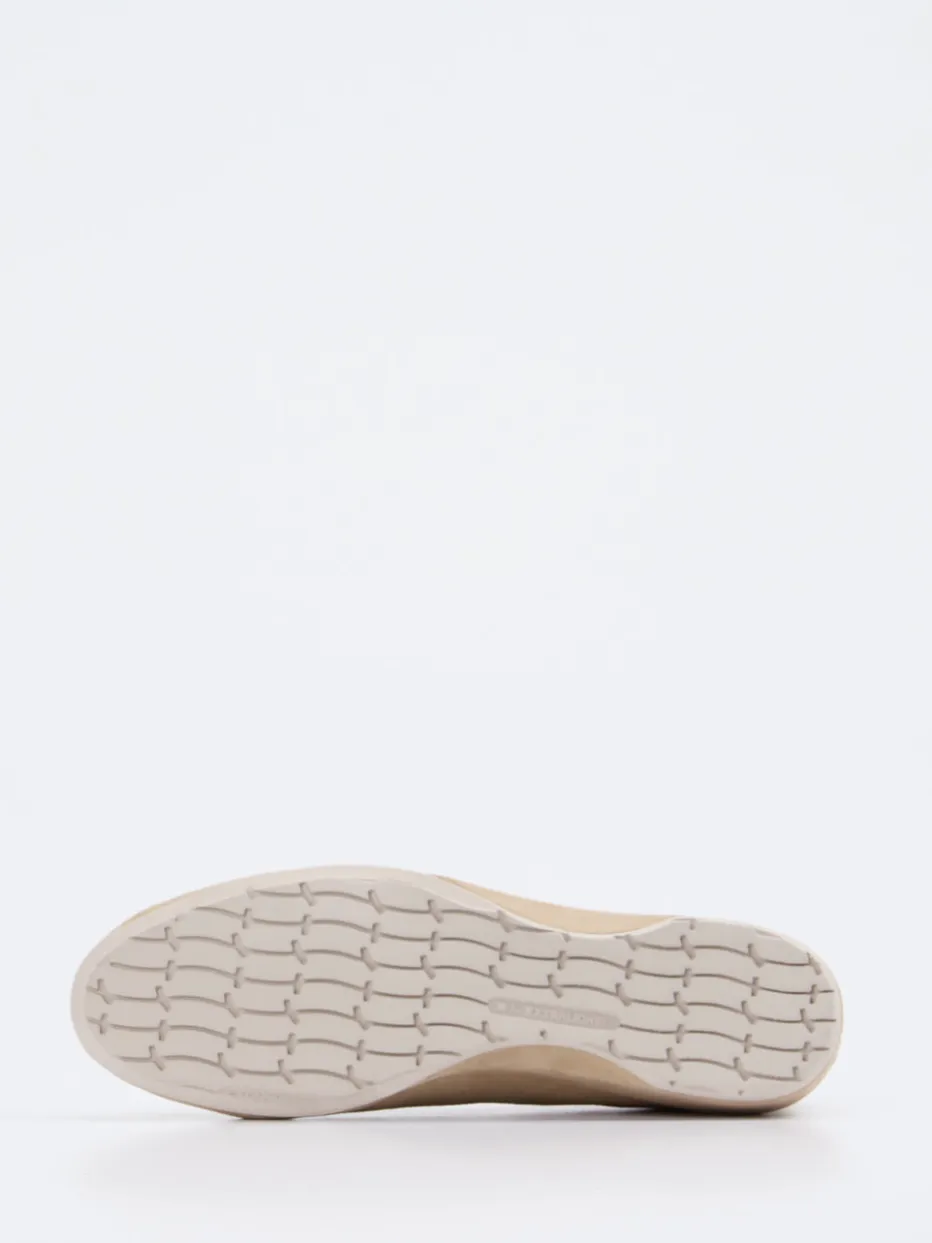 Schlichte Eleganz mit feinem Komfort.Thierry Rabotin präsentiert mit diesen Ballerinas in Beige ein Damenmodell, das Komfort und Stil vereint. Ob im Büro oder im urbanen Alltag – der Keilabsatz sorgt für eine angenehme Laufhöhe, während das samtig matte Veloursleder hochwertig wirkt und sich dem Fuß geschmeidig anpasst. Ein elastischer Textilrandabschluss und eine verspielte Schleife setzen dezente Akzente. Innen bietet türkisfarbenes Lammnappa ein überraschendes Farbdetail und exzellenten Tragekomfort. Die strukturierte Gummisohle mit Markenprägung verhält sich rutschhemmend. Minimalistische Retro-Elemente unterstreichen den „Quiet Luxury“-Ansatz. Kombiniert mit hellen Hosen entsteht ein frühlingshafter Look. Ein stilistisch vielseitiger Klassiker – feminin, leicht und hochwertig verarbeitet.