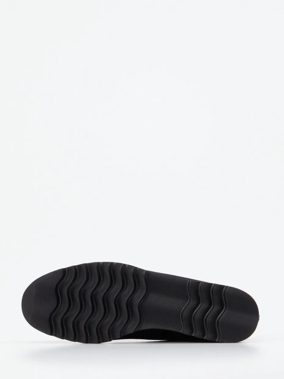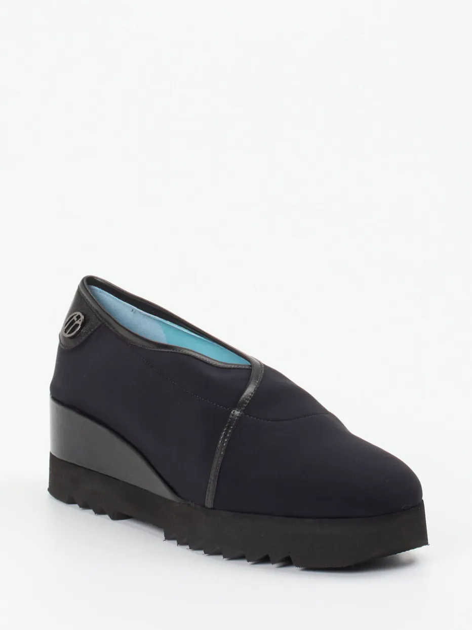 Understatement mit Profil.Thierry Rabotin steht für durchdachtes Schuhdesign – so wie bei diesen stilvollen Damen-Keilpumps. Ob im Büro oder bei urbanen Erledigungen: Das tiefschwarze Textilmaterial mit matter Oberfläche wirkt klar und wertig. Der Keilabsatz mit 5 cm Höhe und markanter Zahnprofilsohle sorgt für komfortable Stabilität. Ton-in-Ton-Paspelierung und ein dezentes Logo-Detail am Fersenbereich unterstreichen den minimalistischen Look. Das türkisfarbene Innenfutter aus Lammnappa setzt einen feinen Akzent. Modisch sind diese Pumps inspiriert von Quiet Luxury und Streetwear. Zeitlos-modern mit typischer Thierry-Rabotin-Leichtfüßigkeit.
