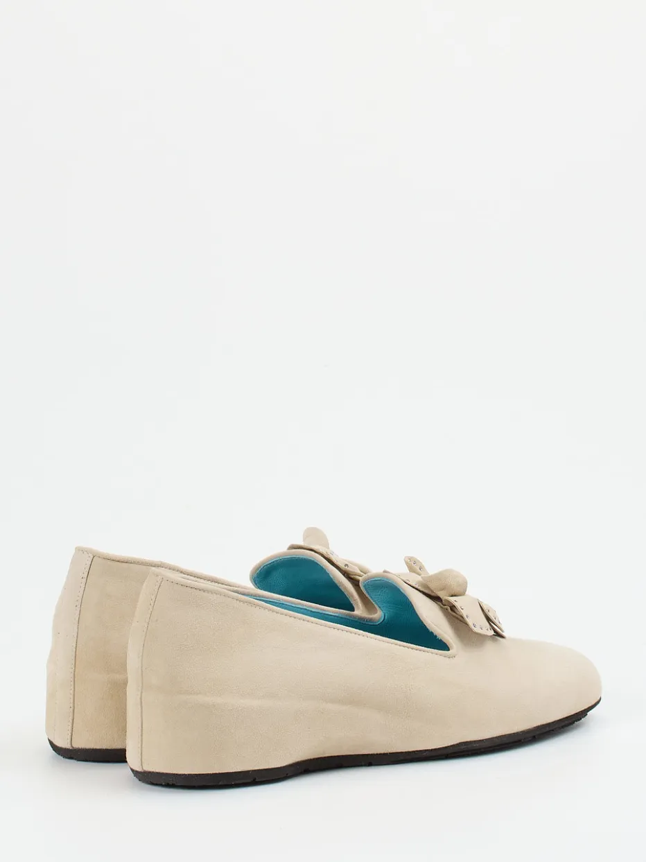Für den Alltag oder entspannte Stunden zu Hause bietet der Pumps mit beigefarbenem, samtig angeschliffenem Veloursleder eine angenehm weiche Haptik. Die keilförmige Silhouette mit lederbezogenem Absatz verleiht dem Look eine elegante Höhe, ohne auf Bequemlichkeit zu verzichten. Blickfang ist die dekorative Schleife mit dezentem Nietenbesatz auf dem Spann. Ein rutschhemmendes Sohlenprofil sowie das azurblaue Lederfutter runden den femininen Gesamteindruck funktional ab. Optimal kombinierbar zu Pastelltönen oder soften Neutrals.