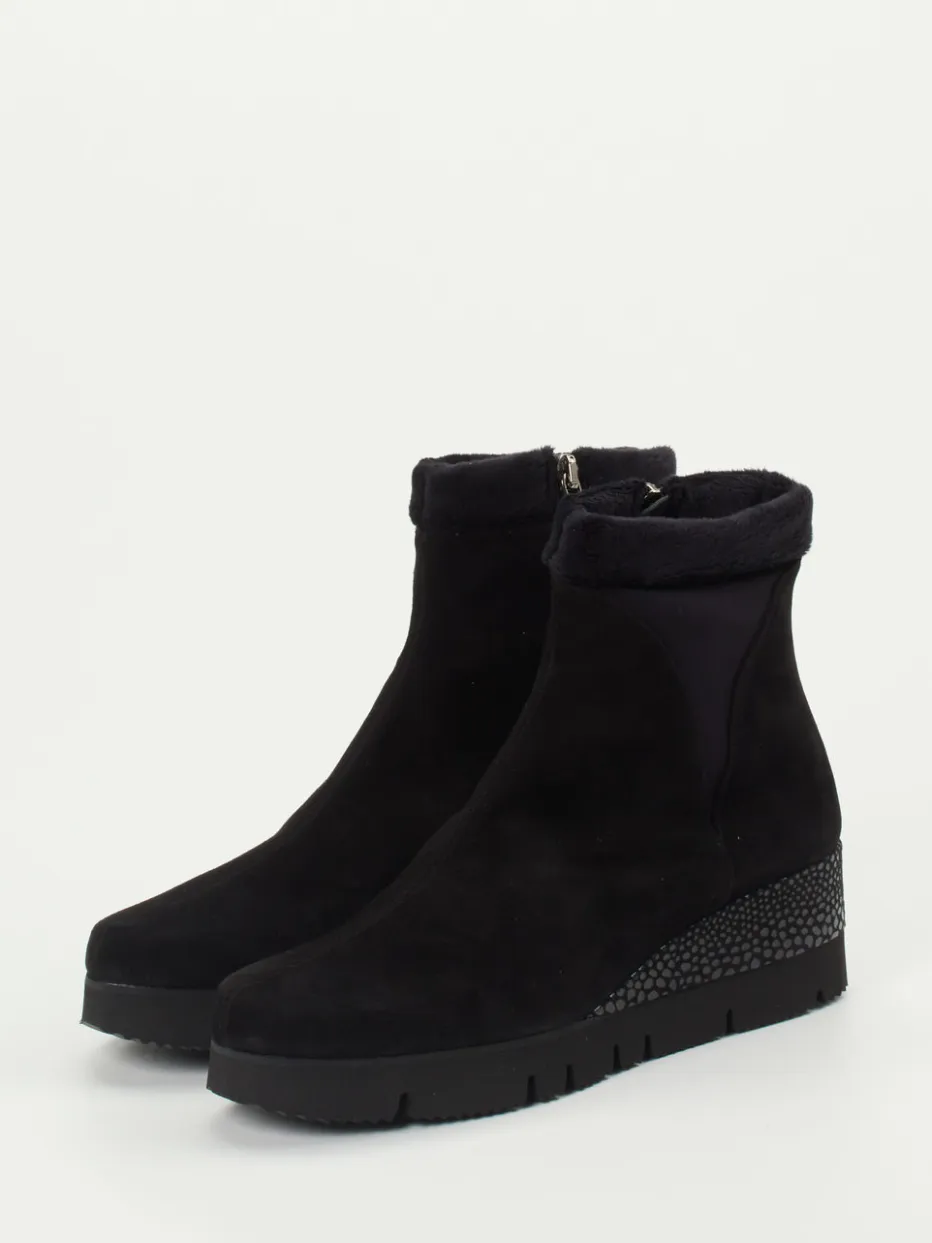 Ideal für entspannte Wintertage mit Stilbewusstsein: Das schwarze Veloursleder ist samtig-matt und trifft auf einen geprägten Keilabsatz in Reptiloptik. Innen sorgt flauschiges Kunstfell für wohlige Wärme, während der seitliche Reißverschluss mit Stretchmaterial einen unkomplizierten Einstieg bietet. Die rutschfeste Leichtzellsohle schafft Sicherheit auf rutschigen Untergründen. Inspiriert von Minimalismus und dem Trend zum „Quiet Luxury“, passt der Look hervorragend zu Thermoleggings und Oversize-Mänteln.