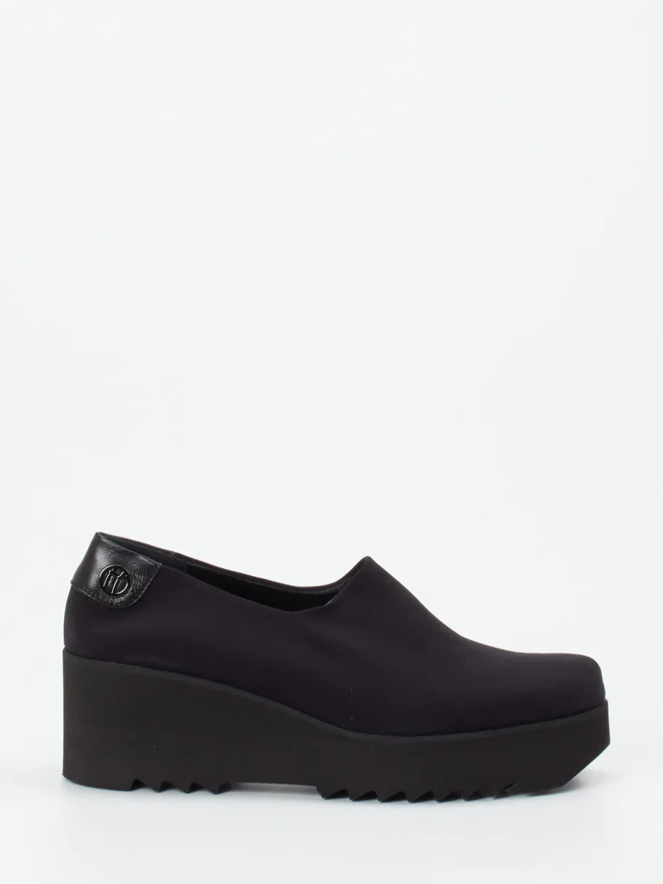 Eine moderne Keilsilhouette in schwarz trifft bei Thierry Rabotin auf elastisches Textil und markante Streetstyle-Elemente – für progressive Looks mit Komfortanspruch.