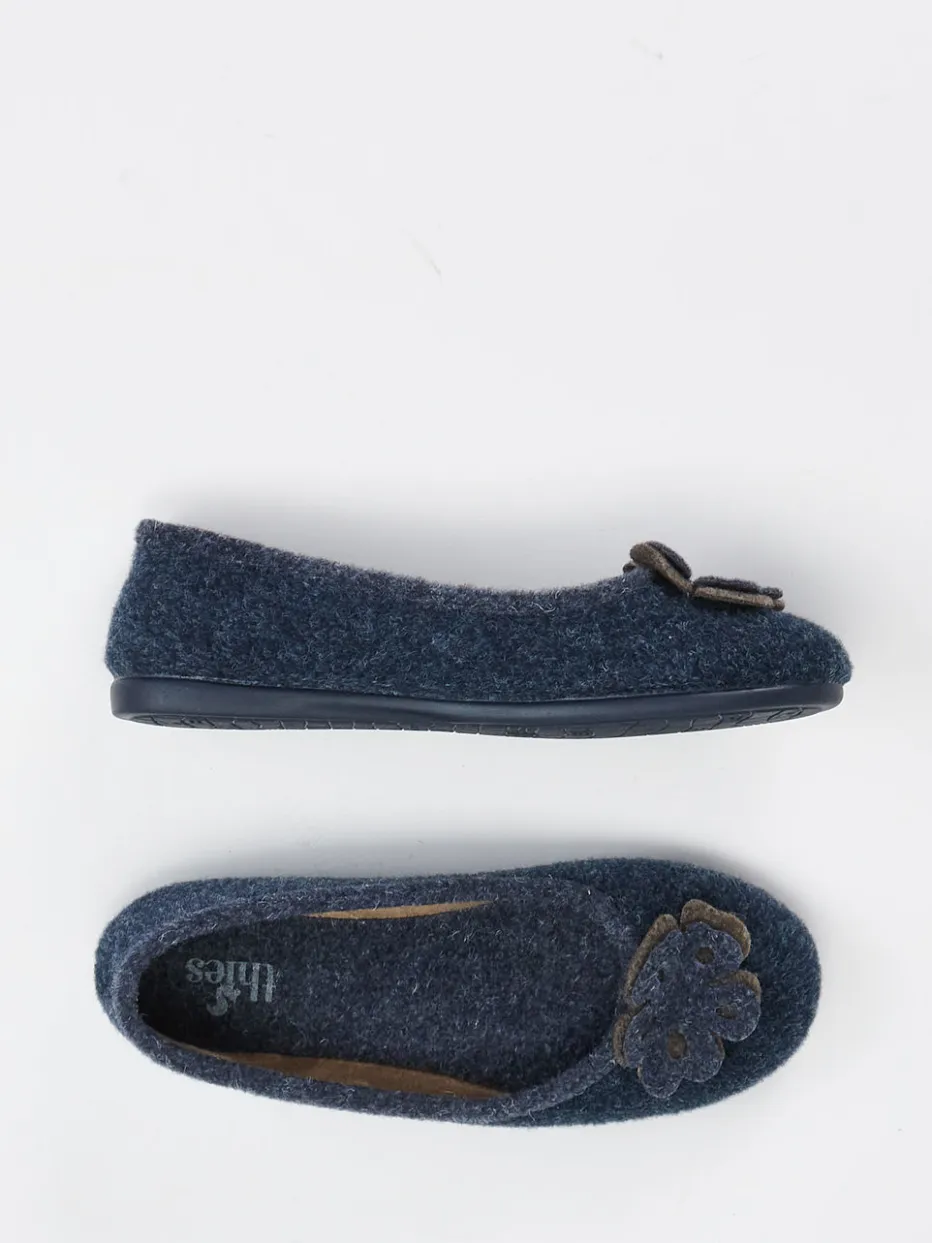 Thies präsentiert diesen Ballerina-Hausschuh für Damen aus dunkelblauem Wollfilz. Die klassisch-runde Silhouette und der Schlupfeinstieg sorgen für einen bequemen Sitz.