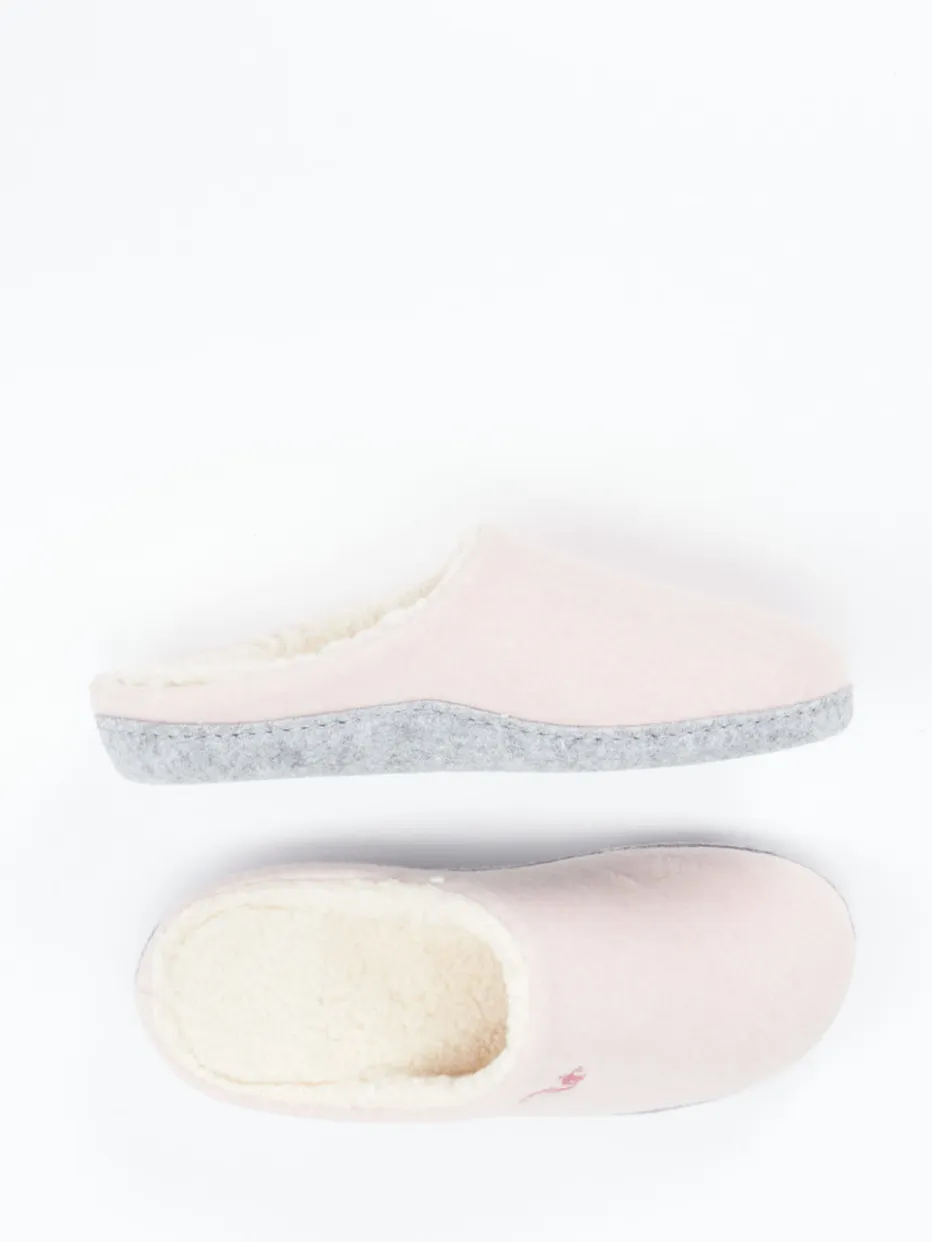Ideal für kühle Morgen oder gemütliche Abende überzeugt das Paar mit rosafarbenem Filz aus recyceltem PET – samtig matt und formstabil. Das flauschige Textilfutter in Cremeweiß schmiegt sich angenehm an. Durch die offene Schlupfform mit geschlossenem Vorderfuß gelingt das Anziehen mühelos. Der hellgraue Filzboden mit Gummipunkten bietet Rutschfestigkeit, während ein Stickmotiv in Rosa liebevolle Akzente setzt. Im Look harmonisch zum Scandi-Trend passt der Hausschuh perfekt zu Loungewear in soften Pastells.