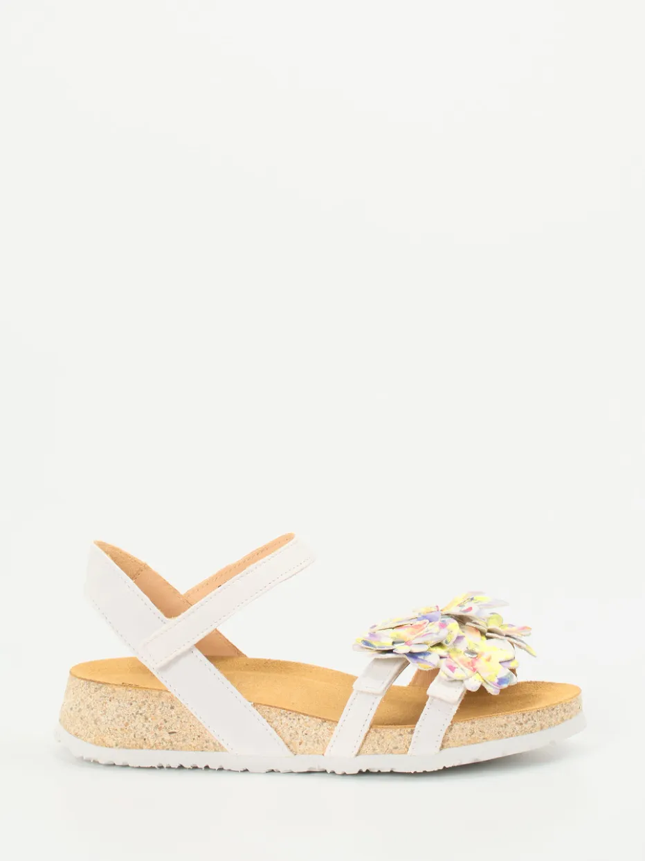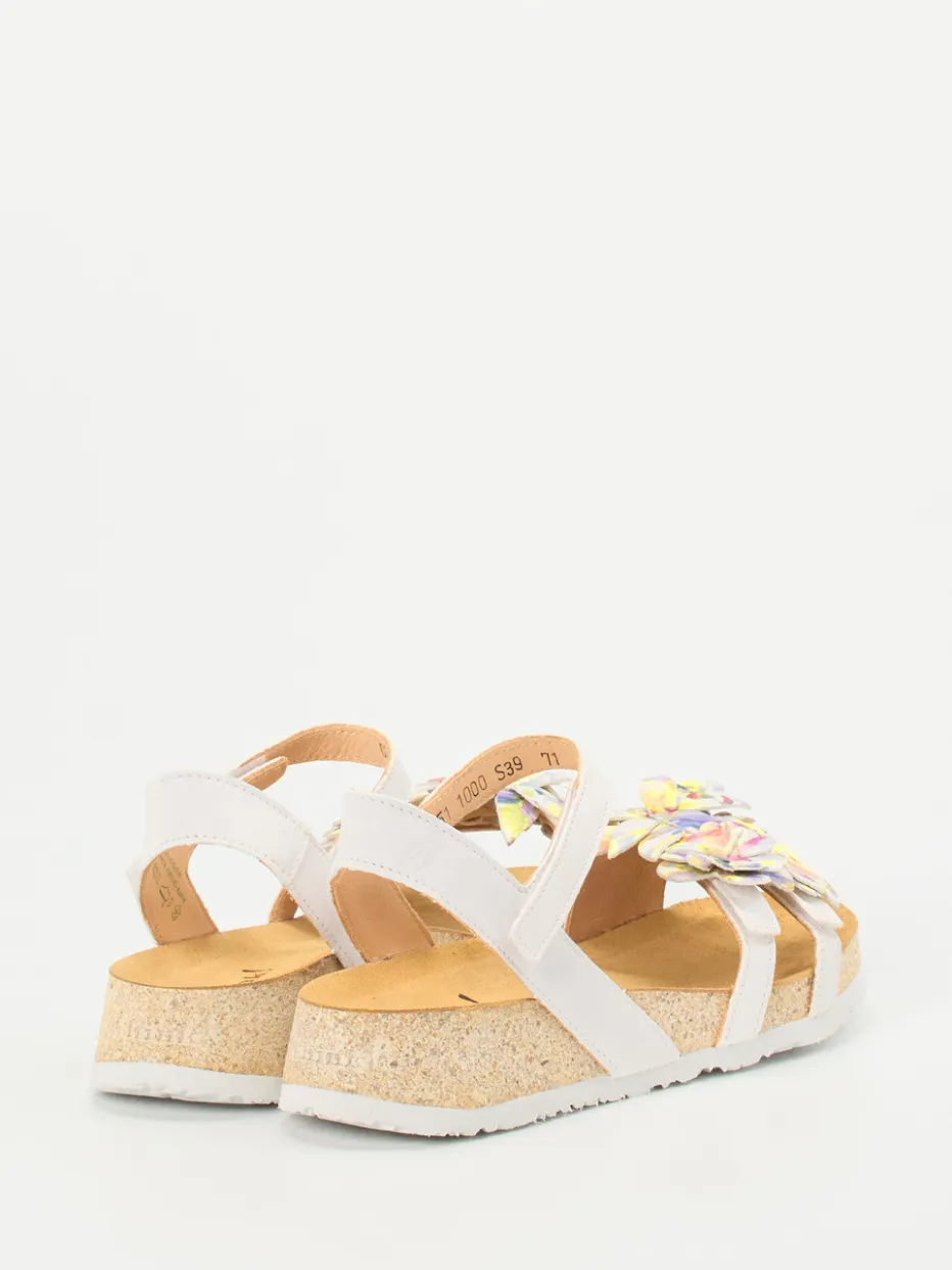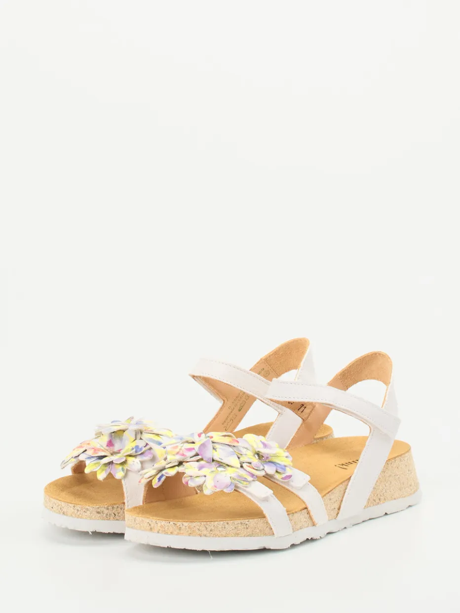 Florale Leichtigkeit trifft Komfort.Think präsentiert eine Damen-Komfortsandale für entspannte Sommertage. Ob beim Stadtbummel oder auf Reisen – die Sandale überzeugt mit einem ergonomisch geformten Fußbett aus lederbezogenem Kork und einem Fersenriemen mit Klettverschluss. Weißes Kalbleder mit matter Oberfläche bildet die Basis für mehrfarbige Blütenapplikationen in Pastellgelb und Lavendel. Die offene, komfortorientierte Silhouette kombiniert modische Leichtigkeit mit Boho-Einflüssen. Eine gelenkschonende Gummisohle und der niedrige Keilabsatz sorgen für angenehmes Laufgefühl. Besonders harmonisch zu luftigen Leinenkleidern oder Strohtaschen. Natürliches Tragegefühl – mit femininer Raffinesse interpretiert.