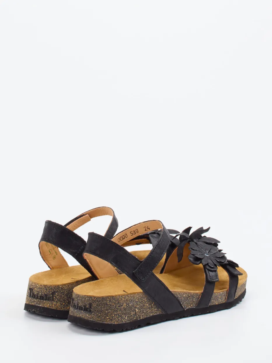 Floraler Komfort für Sommertage.Think präsentiert eine Damen-Komfortsandale voller Leichtigkeit und natürlichem Stil. Für entspannte Ausflüge bei sommerlichen Temperaturen bietet diese schwarze Sandale mit ergonomischem Fußbett aus Kork-Latex optimalen Halt und Komfort. Das glatte, samtig-matte Ziegenleder betont die klare Linienführung, während dreidimensionale Blütenapplikationen mit feinen Nieten ein verspieltes Boho-Element setzen. Der Klettverschluss sorgt für individuelle Anpassung. Die profilierte Gummisohle ist rutschhemmend und alltagstauglich. Stilistisch passt das Modell zu Leinenkleidern oder Strohtaschen. Ein authentischer Sommerbegleiter mit hochwertiger Materialwahl und markentypischem Trageerlebnis.