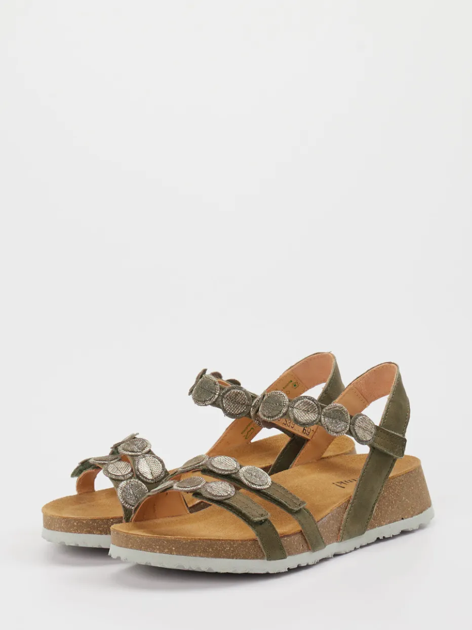 Die Marke Think präsentiert eine bequeme Damensandale mit offener Form und Kork-Plateau. Ideal für lange Spaziergänge oder entspannte Urlaubstage. Das Obermaterial aus hochwertigem Ziegenleder zeigt eine matte Veloursoptik in modernem Olivgrün. Silberfarbene runde Zierdetails betonen den Boho-Charakter, während das anatomisch geformte Fußbett und die rutschhemmende Gummisohle für Komfort und Halt sorgen. Praktisch ist der verstellbare Klettverschluss, der einen leichten Einstieg ermöglicht. Kombinierbar mit Leinenhose oder Basttasche entsteht ein natürlicher Look.