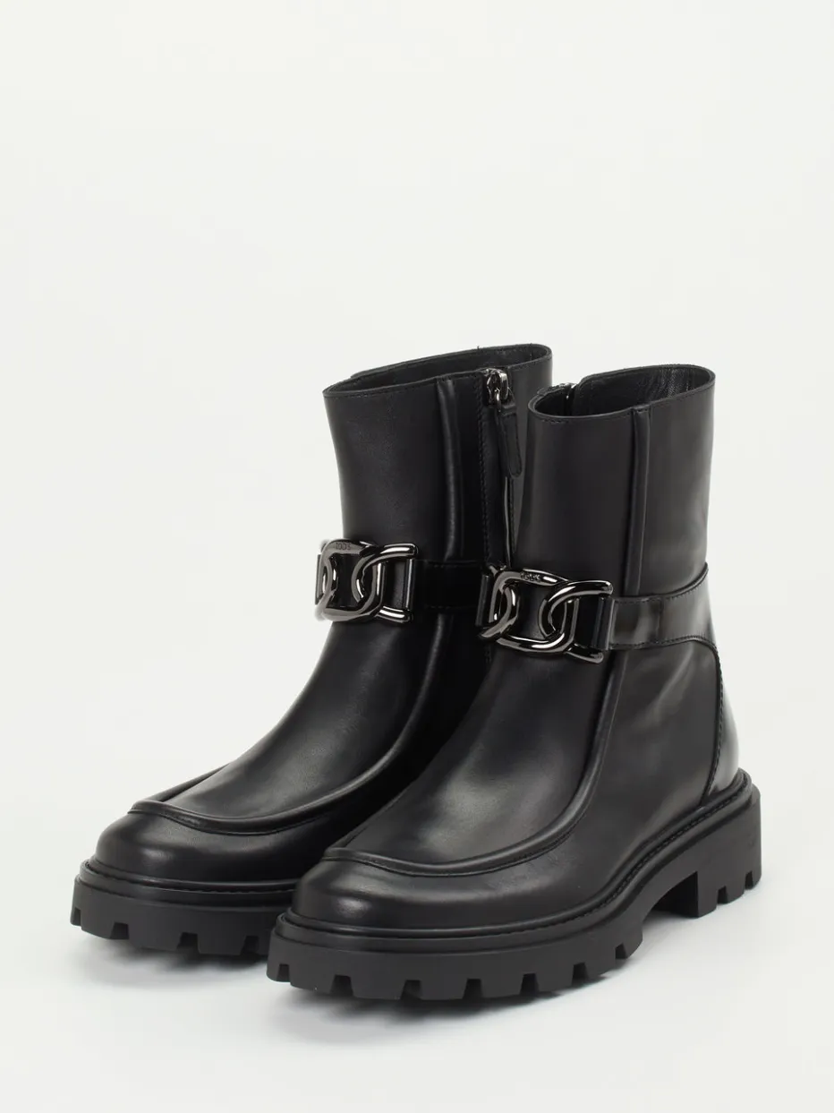 Diese Biker-Stiefelette von Tod’s verkörpert moderne Streetwear mit luxuriöser Verarbeitung. Die Kombination aus glänzendem Kalbleder und Statement-Kettenoptik definiert modische Präsenz.