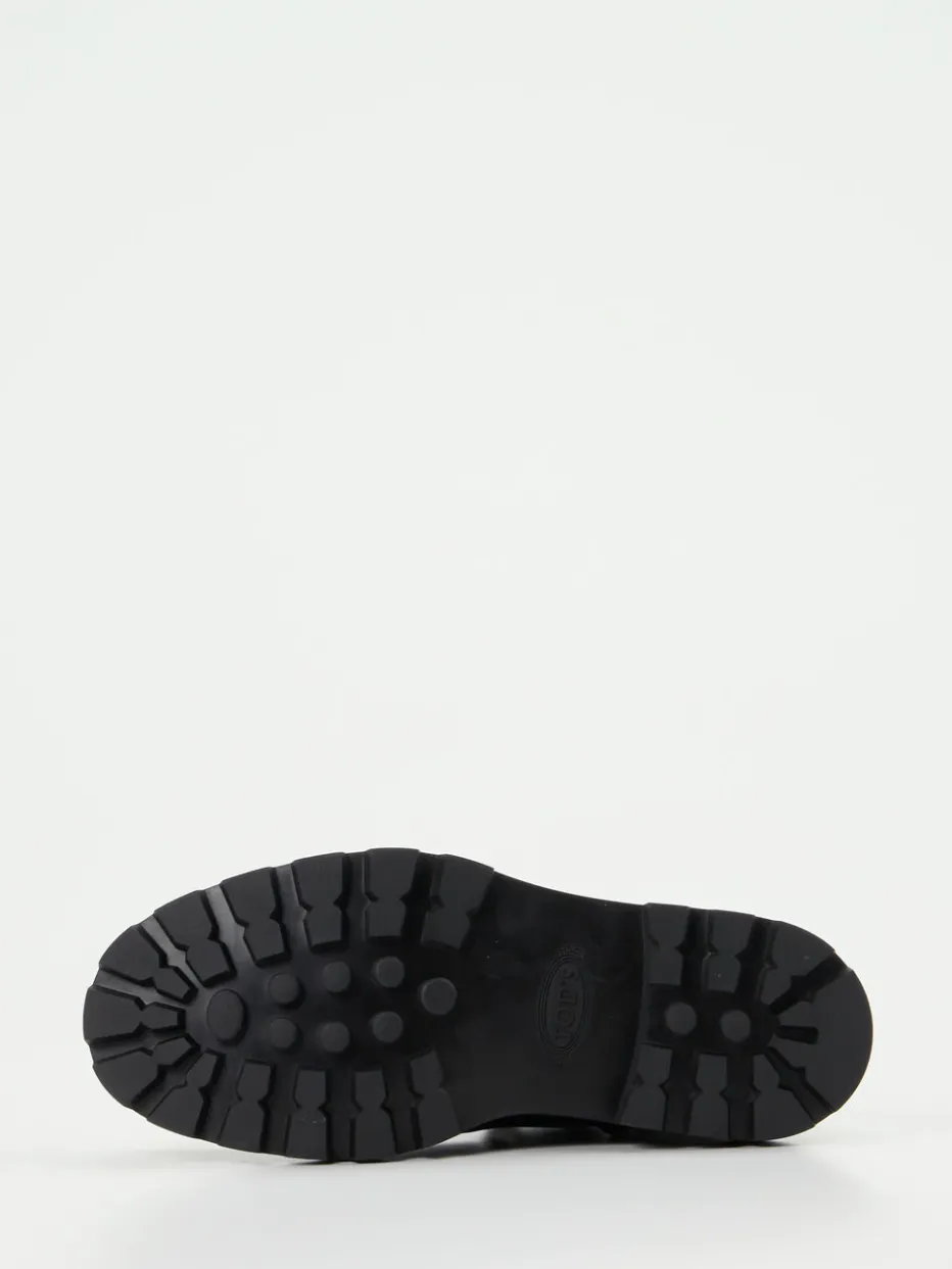 Edler Streetstyle mit markanter Attitüde.Tod’s präsentiert diese Damen-Stiefelette im angesagten Biker-Look. Für urbane Outfits mit Stilgefühl bietet das Modell hochwertigen Tragekomfort und kraftvolle Ausdrucksstärke. Hergestellt aus edlem Kalbleder mit glänzender Oberfläche und ergänzt um eine massive Gummisohle, zeigt sich der Schuh in tiefem Schwarz mit Ton-in-Ton-Nähten und markanter Metallkette in Gunmetal-Optik. Die knöchelhohe, rund zulaufende Silhouette mit Innenreißverschluss steht für funktionale Alltagstauglichkeit, unterstützt durch einen sicheren Tritt auf chunky profilierter Sohle. Streetwear-Einflüsse und Hardware-Trends machen das Design besonders trendorientiert. Lässt sich ideal zu Oversized-Mänteln und Crossbody-Taschen kombinieren. Luxus trifft auf progressive Formsprache – ein authentischer Ausdruck der Tod’s-DNA.